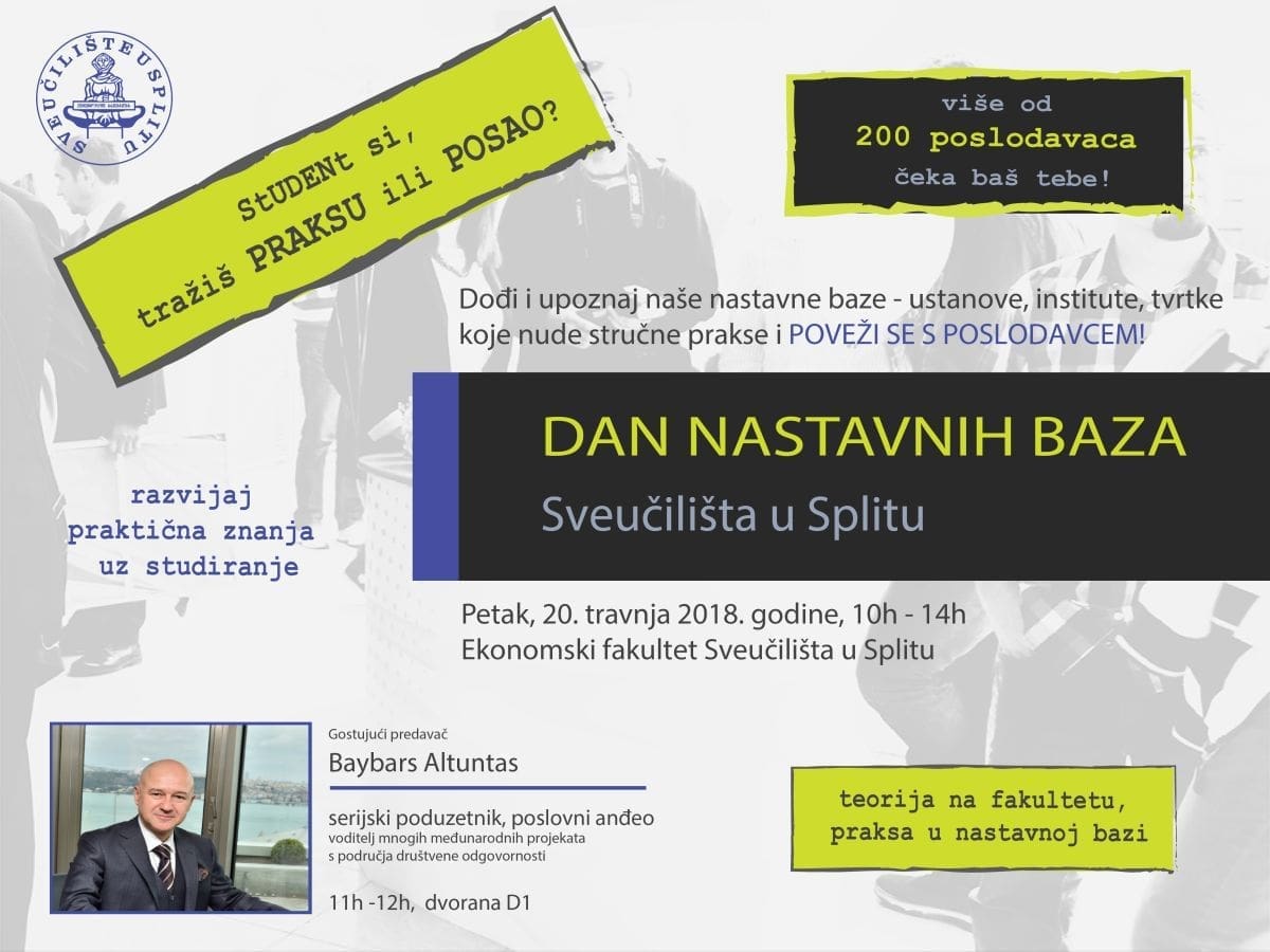Dan nastavnih baza Sveučilišta u Splitu održat će se u petak, 20. travnja, od 10 do 14 sati na Ekonomskom fakultetu, Cvite Fiskovića 5, tijekom kojeg će se studentima predstaviti brojni suradnici i partneri gospodarstvenici splitskog Sveučilišta. Posjetitelji će na taj način imati priliku bolje upoznati nastavne baze sveučilišta - ustanove, institute, tvrtke, koje će studentima nuditi stručne prakse. Ovdje se prvenstveno misli na praktični dio nastave, gdje mentori iz nastavnih baza prenose svoje znanje, iskustvo i vještine na studente našeg Sveučilišta i tako im pomažu da se teoretska znanja povežu s praksom.