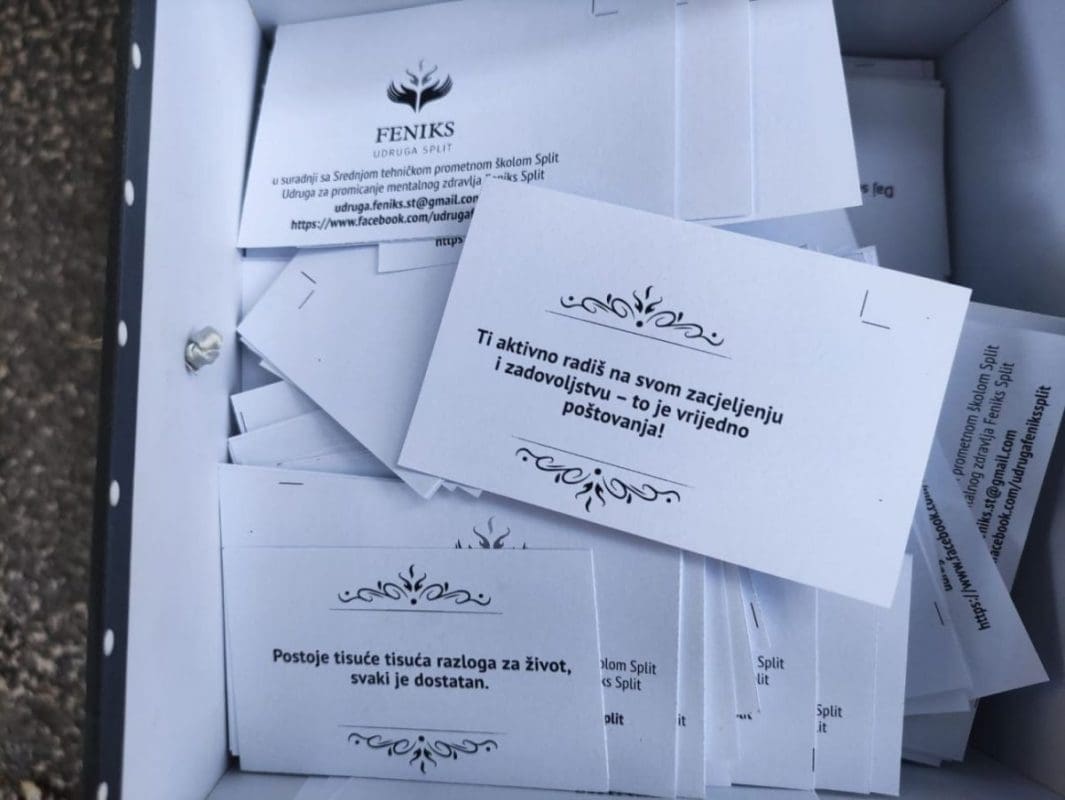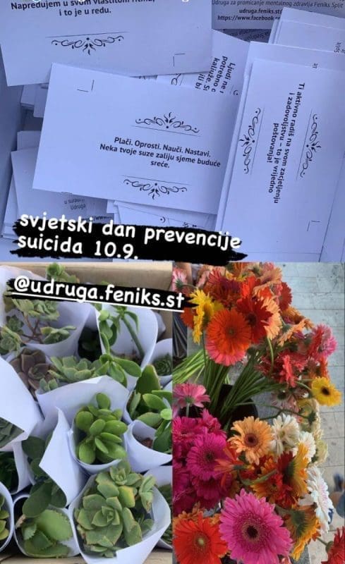 Danas je povodom Svjetskog dana prevencije suicida Udruga Feniks Split sugrađanima podijelila 566 cvjetova i osnažujućih poruka u spomen na isti broj osoba koje su tijekom prošle godine preminule počinivši suicid.