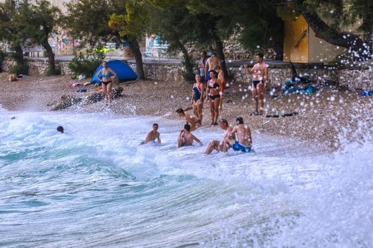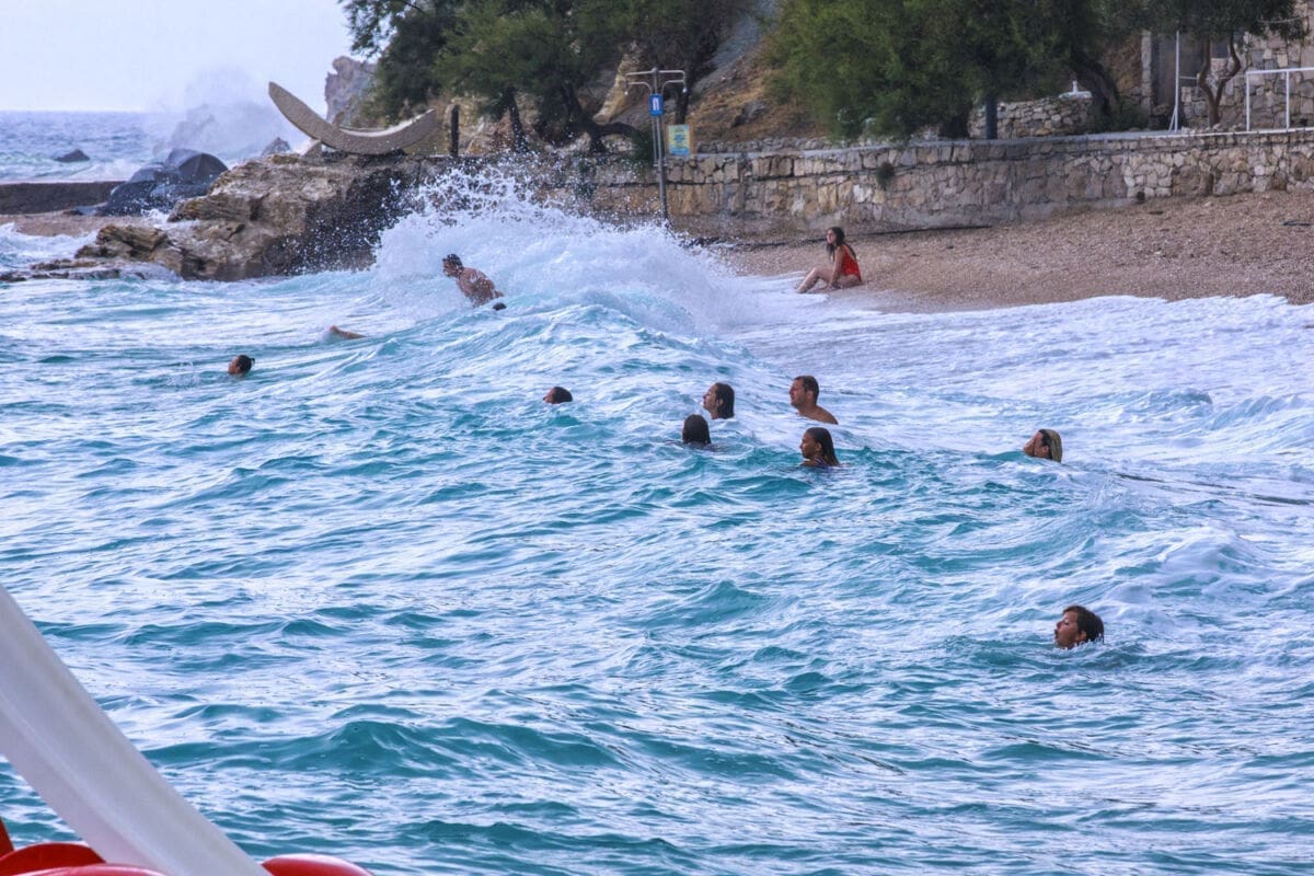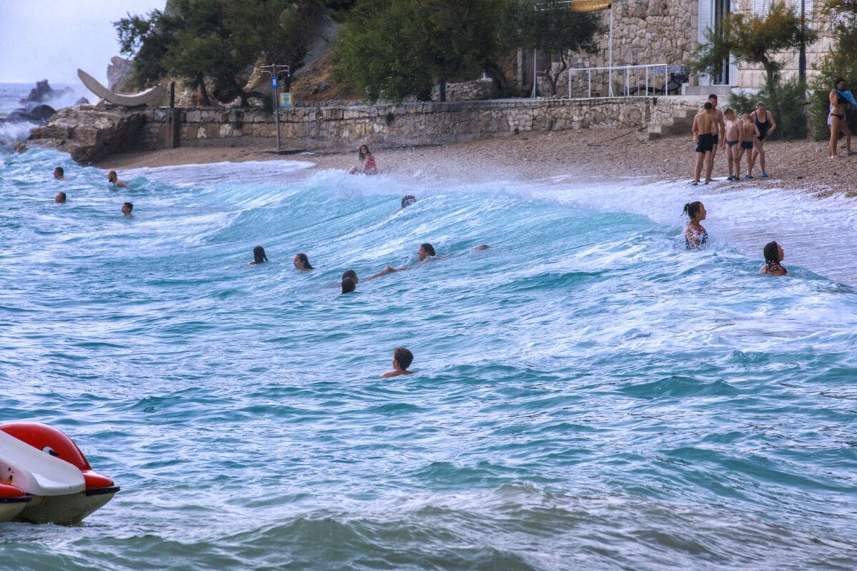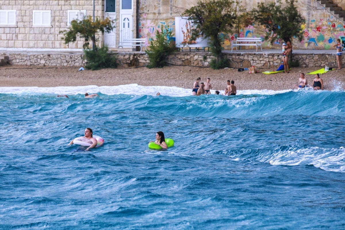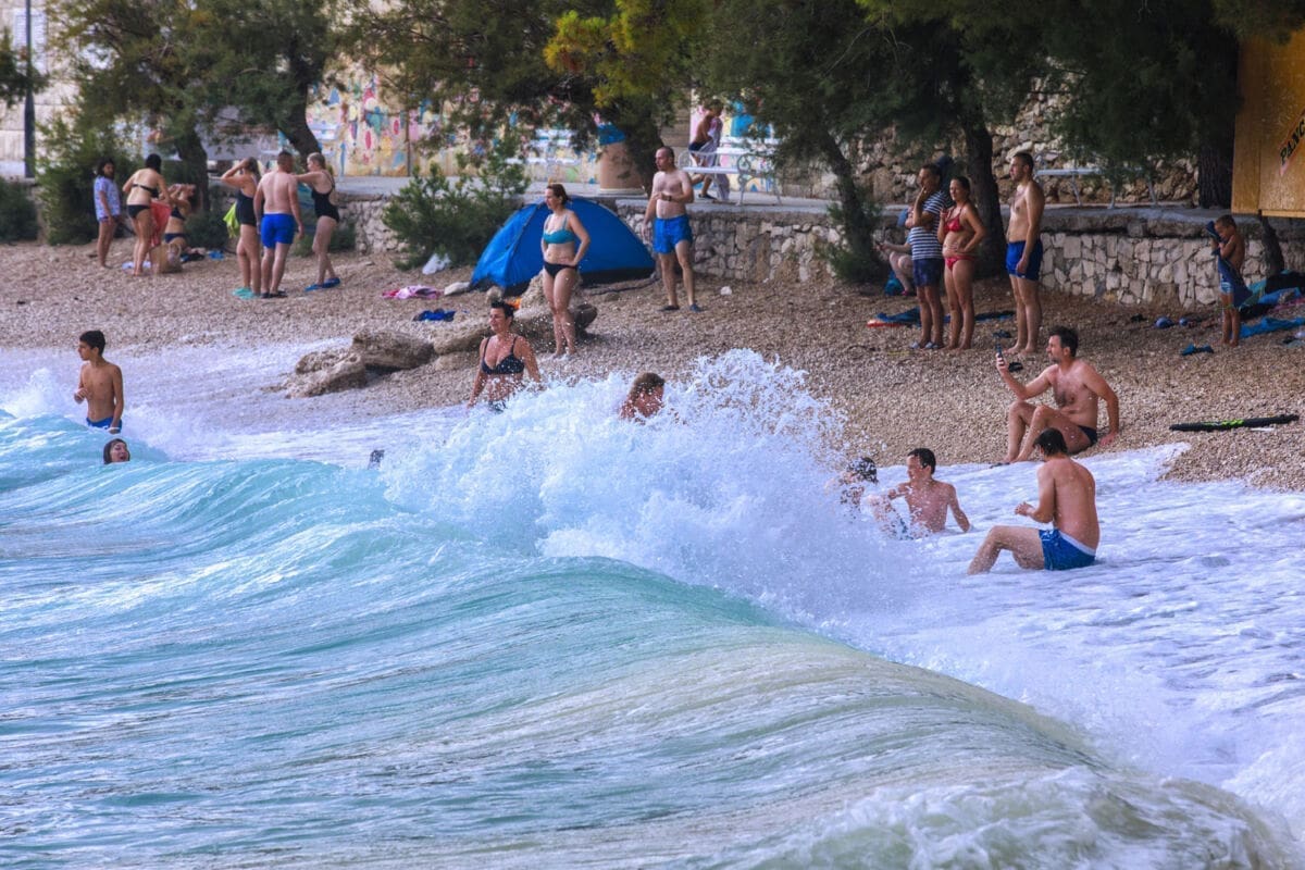 More je i dalje toplo pa su mu površinske temperature većinom od 24 do 26°C. Tamo gdje u Dalmaciji nije bilo izraženog nevremena plaže su bile pune, bez obzira na snažno jugo. Jugo je diglo visoke valove, ali ne tolike da bi spriječili pravu zabavu na plaži.