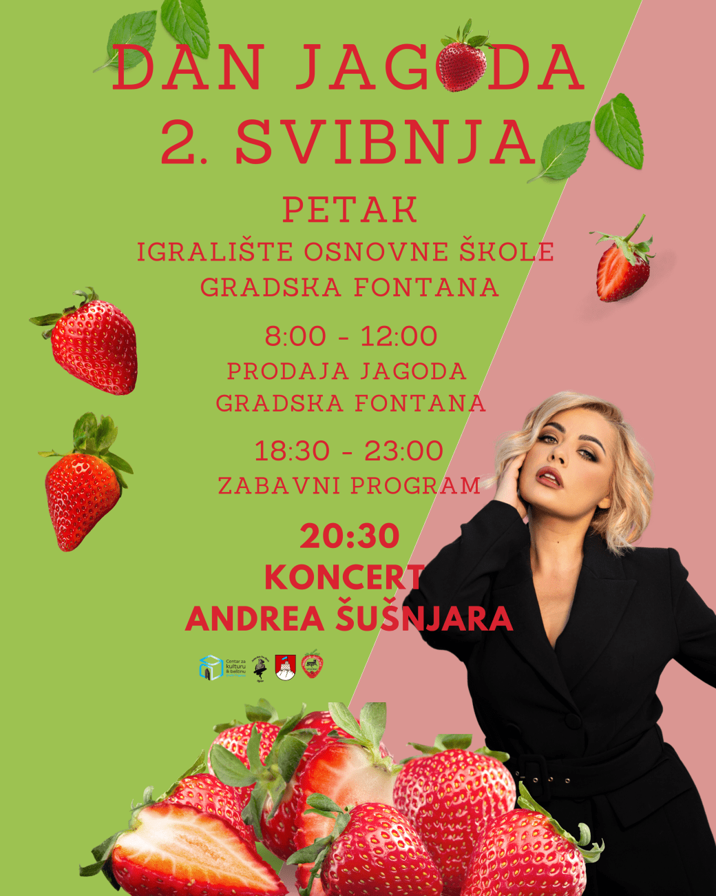 Poseban vrhunac večeri bit će nastup Andree Šušnjare, koja se, nakon 14 godina provedenih u grupi Magazin, odlučila za samostalnu karijeru. Koncert počinje u 20:30 sati. Vrgoračke jagode sinonim su za vrhunsku kvalitetu, a njihov uspjeh duguje se plodnom tlu i jedinstvenom podneblju. Neka vas i ove godine osvajau svojim neodoljivim okusom!