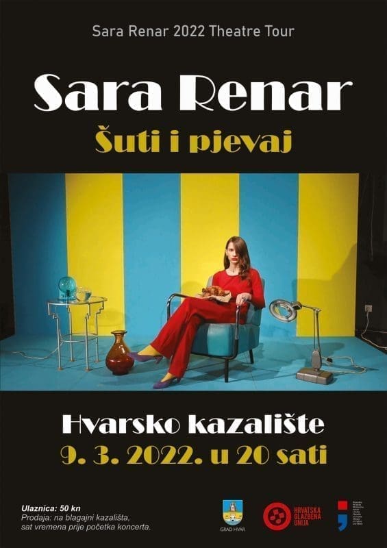 U srijedu, 9. ožujka, koncert će održati Sara Renar, nagrađivana zagrebačka kantautorica i svestrana umjetnica iz skupine najpriznatijih glazbenih imena nove generacije u regiji. Sara Renar stiže u hvarsko kazalište u okviru svoje kazališne turneje Sara Renar 2022 Theatre Tour, koju otvara koncertom u Kazalištu Marina Držića u Dubrovniku u utorak, a nakon Hvara nastupit će u Kući umjetnosti Arsen u Šibeniku.