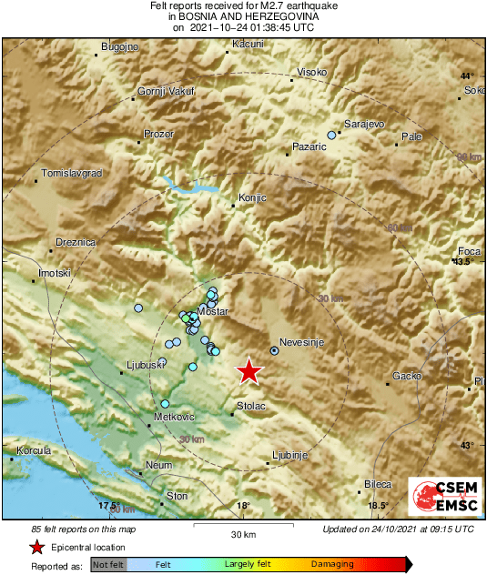 Kako je izvijestio EMSC, magnituda potresa je iznosila 2.7 prema Richteru, a epicentar je bio 14 kilometara od Stoca.