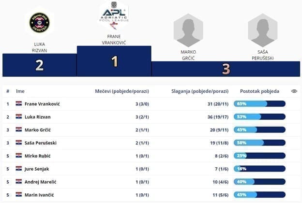 Nakon 5 odigranih turnira te grupne faze doigravanja u finalnom meču nastupili su Luka Rizvan i Frane Vranjković koji je slavio s rezultatom 7-8.