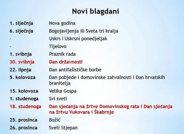 Druga promjena odnosi se na 18. studenoga koji postaje Dan sjećanja na žrtve Domovinskog rata i Dan sjećanja na žrtvu Vukovara i Škabrnje i bit će neradan dan, piše Index.