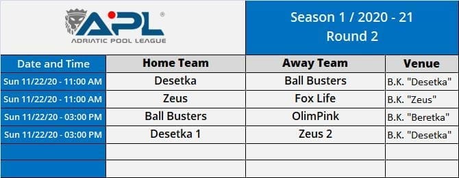 U nedjelju, 15. studenog započinje APL liga sa svojim natjecanjem. Jadranska biljar liga je osnovana tijekom rujna 2020. Okuplja formirane timove iz Dalmacije koji se bore za najboljega u ligi, pojedinačno kao i u parovima te timski.