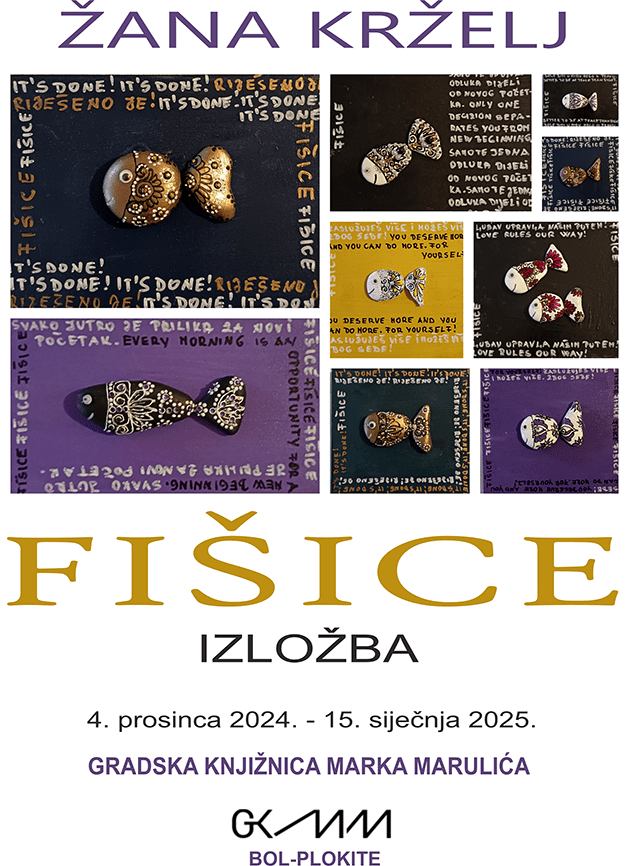 Danas se s početkom u 18:00 sati, u knjižnici Bol-Plokite u Splitu, otvara se izložba "Fišice" autorice Žane Krželj. Izložba će biti otvorena za javnost do 15. siječnja 2025., pružajući posjetiteljima priliku da otkriju jedinstveni svijet malenih umjetničkih djela izrađenih od kamenčića s porukama ohrabrenja.