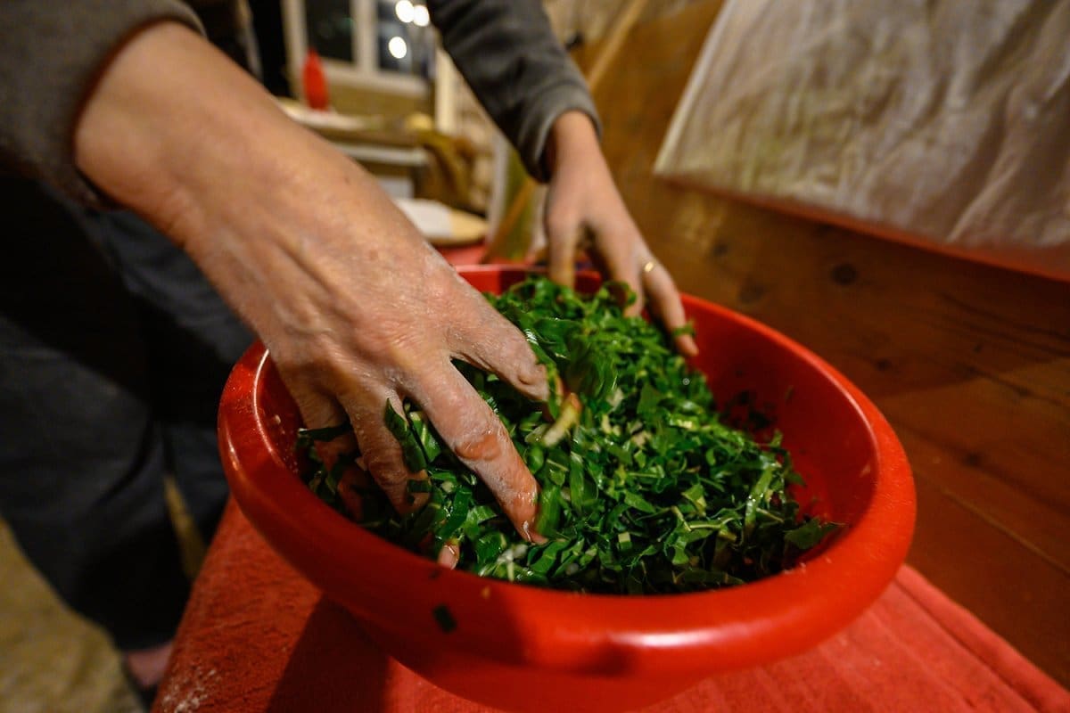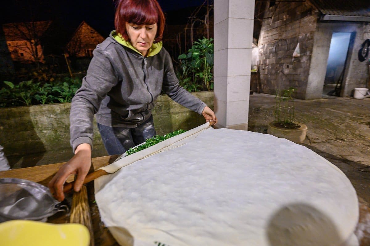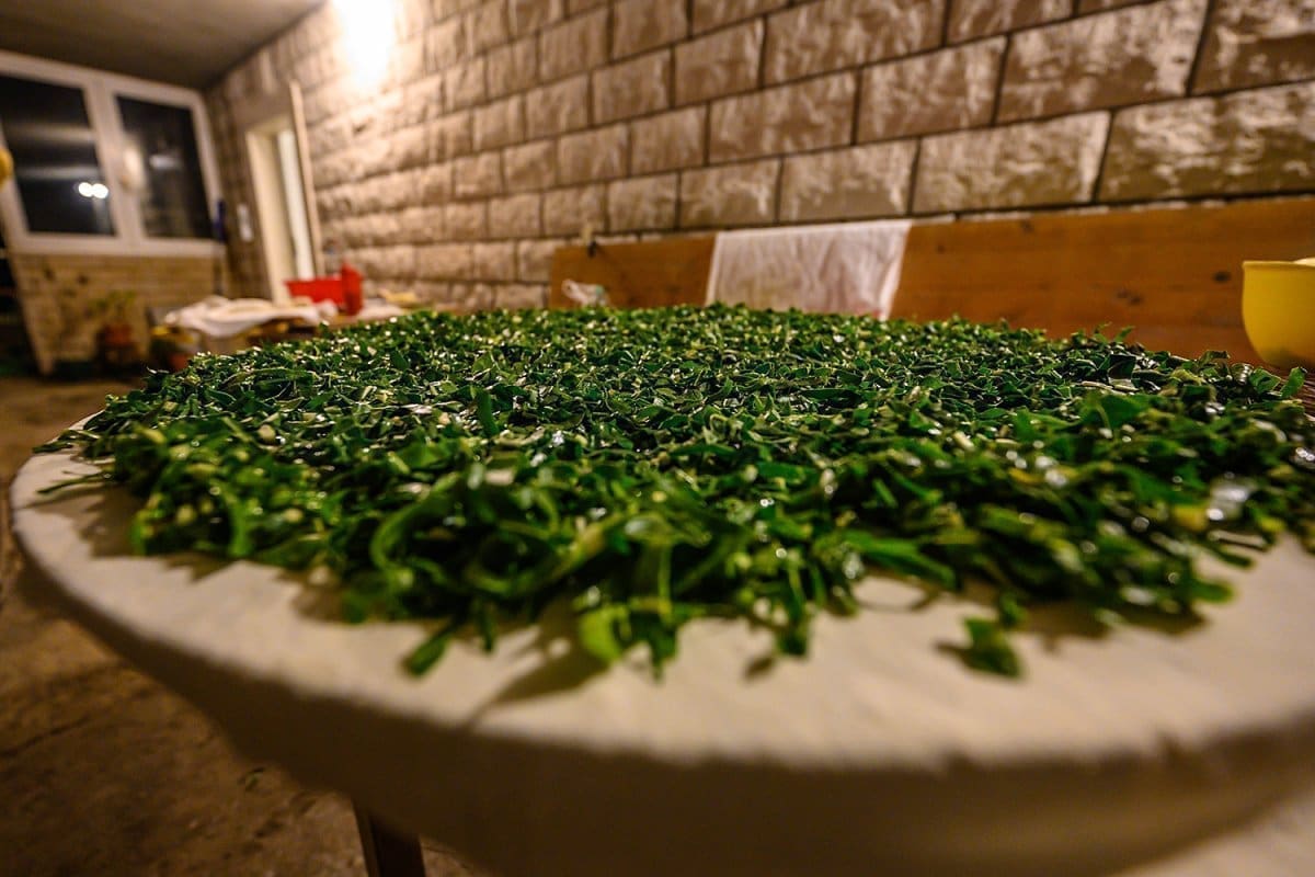 Zatim raspodijelimo tijesto u dvije opno. Jednu stavimo valjati, a drugu nešto kasnije. Na tijesto potom stavljamo isjeckanu blitvu. Količina blitve je 2 do 2,5 kg, ovisno o promjeru sinije. Što se tiče starosti blitve, to je pretežno stara blitva. Ne možete staviti mladu blitvu, ne dolazi u obzir. Ta bi blitva pustila zeleni sok i tijesto bi pozelenili. Blitva mora biti starija, da je barem tri mjeseca bila u vrtlu. Kaže se da je, upravo zbog blitve, stađun soparnika od Mrtvog dana do Uskrsa. Liti se može raditi soparnik, ali to nije ta čar ni draž - govori nam gospođa Čorić.