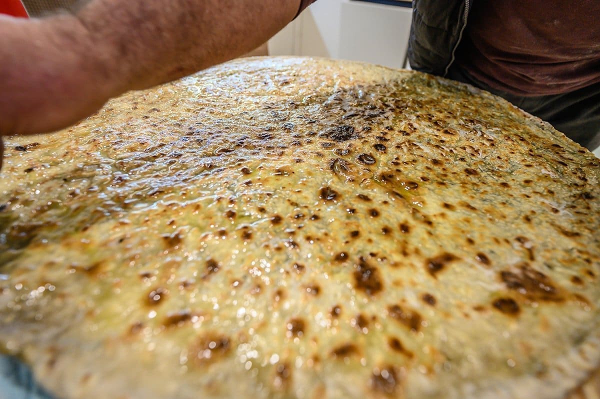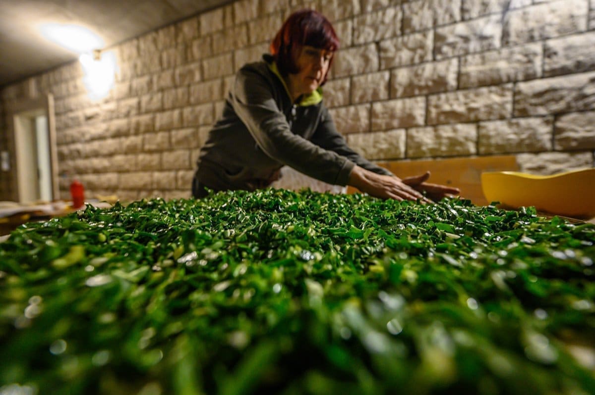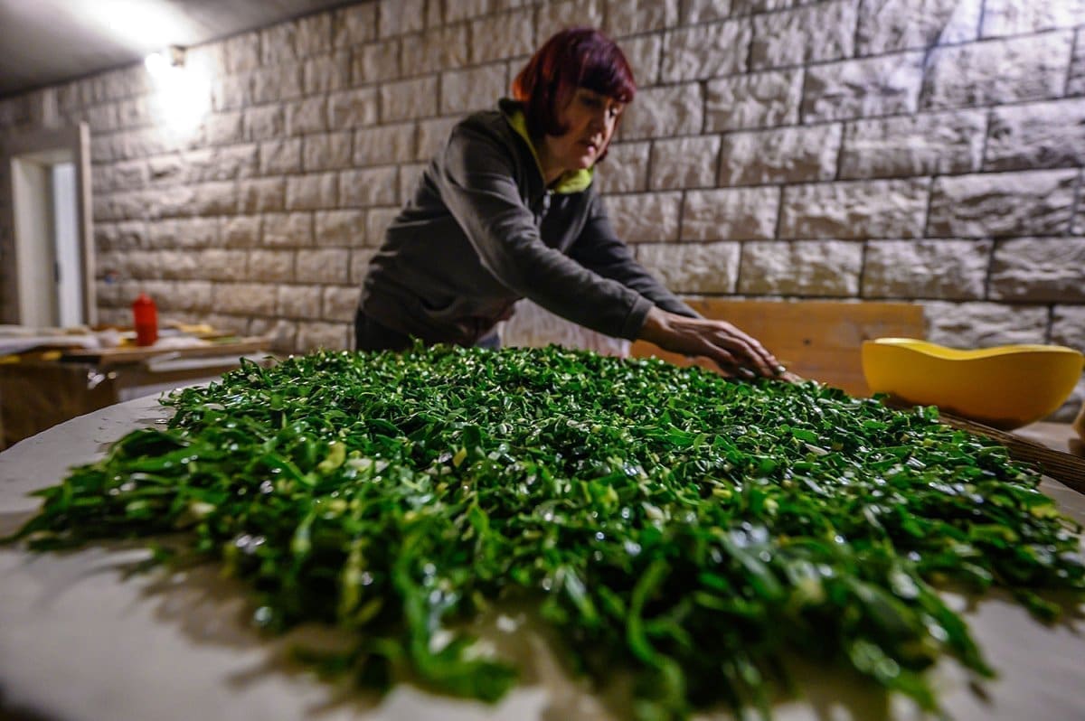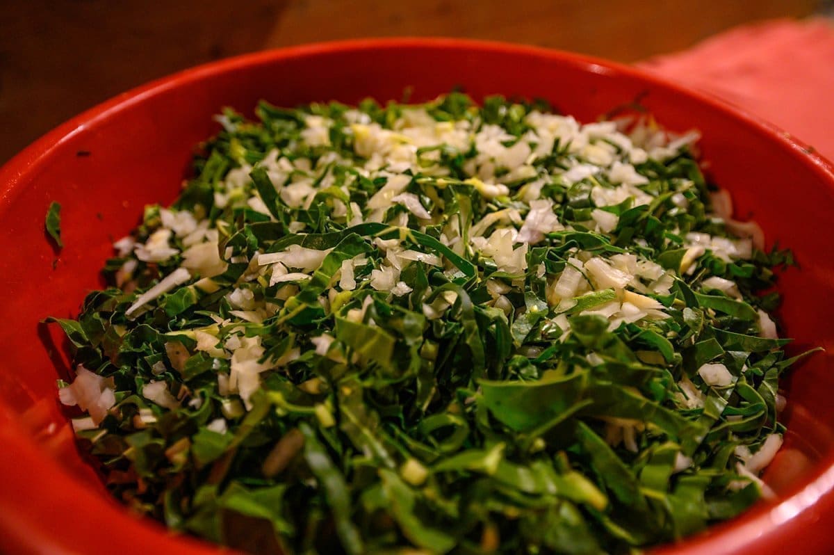 Zatim raspodijelimo tijesto u dvije opno. Jednu stavimo valjati, a drugu nešto kasnije. Na tijesto potom stavljamo isjeckanu blitvu. Količina blitve je 2 do 2,5 kg, ovisno o promjeru sinije. Što se tiče starosti blitve, to je pretežno stara blitva. Ne možete staviti mladu blitvu, ne dolazi u obzir. Ta bi blitva pustila zeleni sok i tijesto bi pozelenili. Blitva mora biti starija, da je barem tri mjeseca bila u vrtlu. Kaže se da je, upravo zbog blitve, stađun soparnika od Mrtvog dana do Uskrsa. Liti se može raditi soparnik, ali to nije ta čar ni draž - govori nam gospođa Čorić.