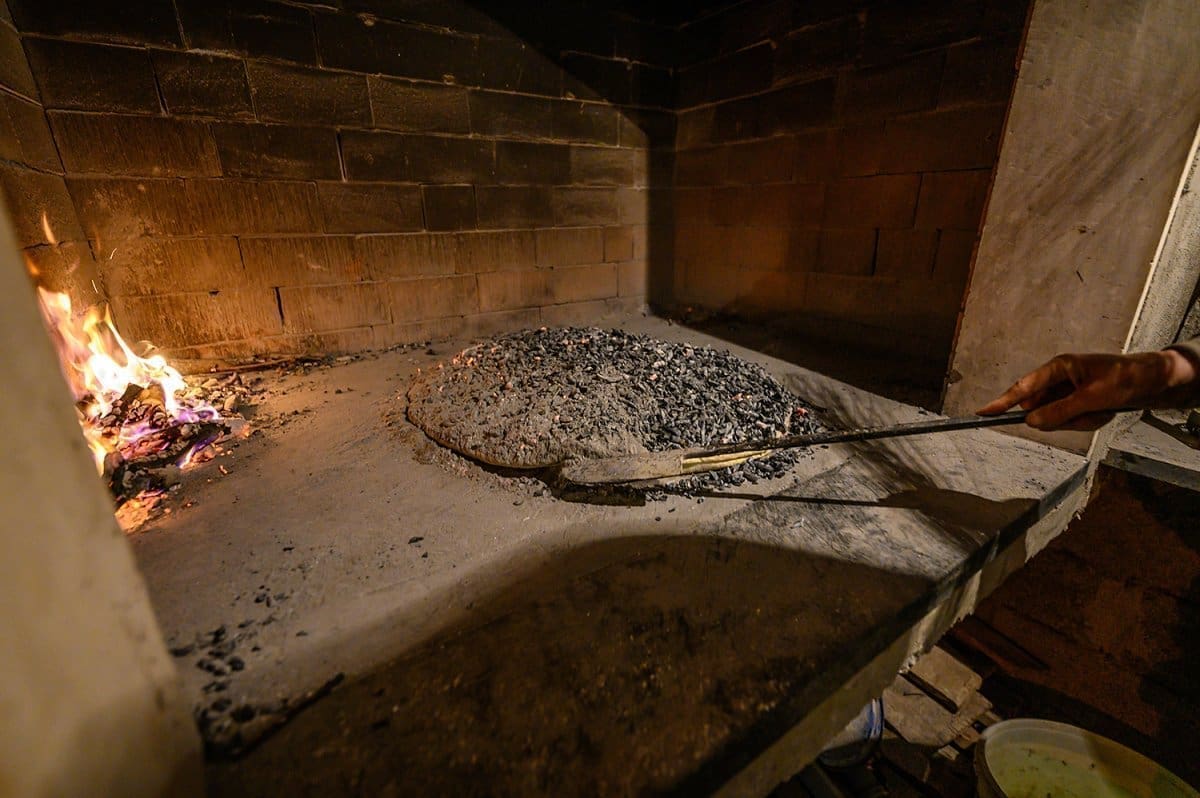 Vatra se potom raspodijeli na dva dijela, a soparnik stavi na pečenje. Nijedan soparnik ne može biti gotov za manje od 15 do 20 minuta. Soparnik nije palačinka! Nakon što je soparnik dobro ispečen, a ja ga uspijem prevrnuti i na drugu stranu. Tu treba dosta iskustva. Koliko god ljudi mislili da je lako, nije! Soparnik se potom izvadi iz luga. a kada ga potpuno očistimo nitko ne bi rekao da je bio pokriven lugom u cijelosti. Soparnik se stavlja na siniju gdje ga mažemo čistim maslinovim uljem. Zatim se maže druga strana i stavlja luk. Potom ga režemo na fete u obliku rombova. Rombovi da bi svi dobili približno jednaku fetu soparnika. To su naši stari odredili bez ove moderne tehnologije, znanstvene fantastike i koječega - pojašnjava vrijedna Poljičanka.