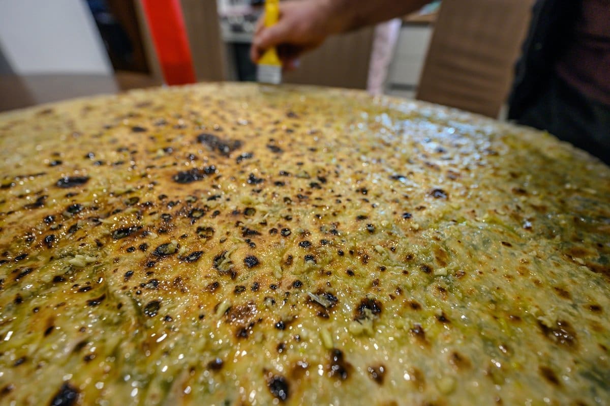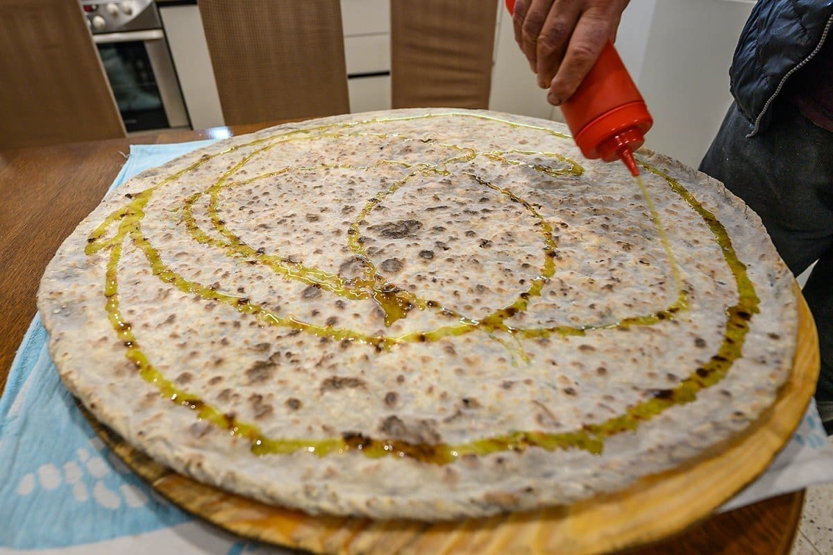 Inače, ja u blitvu stavim jednu kapulu. Ako se pitate zašto, kapula ima svoju slast koja blitvi daje posebnu čar. Možda netko iz nekog razloga ne želi stavljati kapulu. Blitva je sama za sebe gorka, a kapula joj daje konču. Kada smo razvaljali drugo tijesto, poklopit ćemo to i pritisnuti sinijom, da se tijesto i blitva sjedine. Nakon toga se višak tijesta odrubi, a potom se soparnik okroji i zafrnjoka, napraviti lijepu pletenicu. Moj je običaj potom soparnik posuti pšeničnim ili kukuruznim brašnom, ali pretežno kukuruzovim jer će bolje skliznuti sa sinije, a ako je komin gorniji, pomoći će da se ne zalijepi.