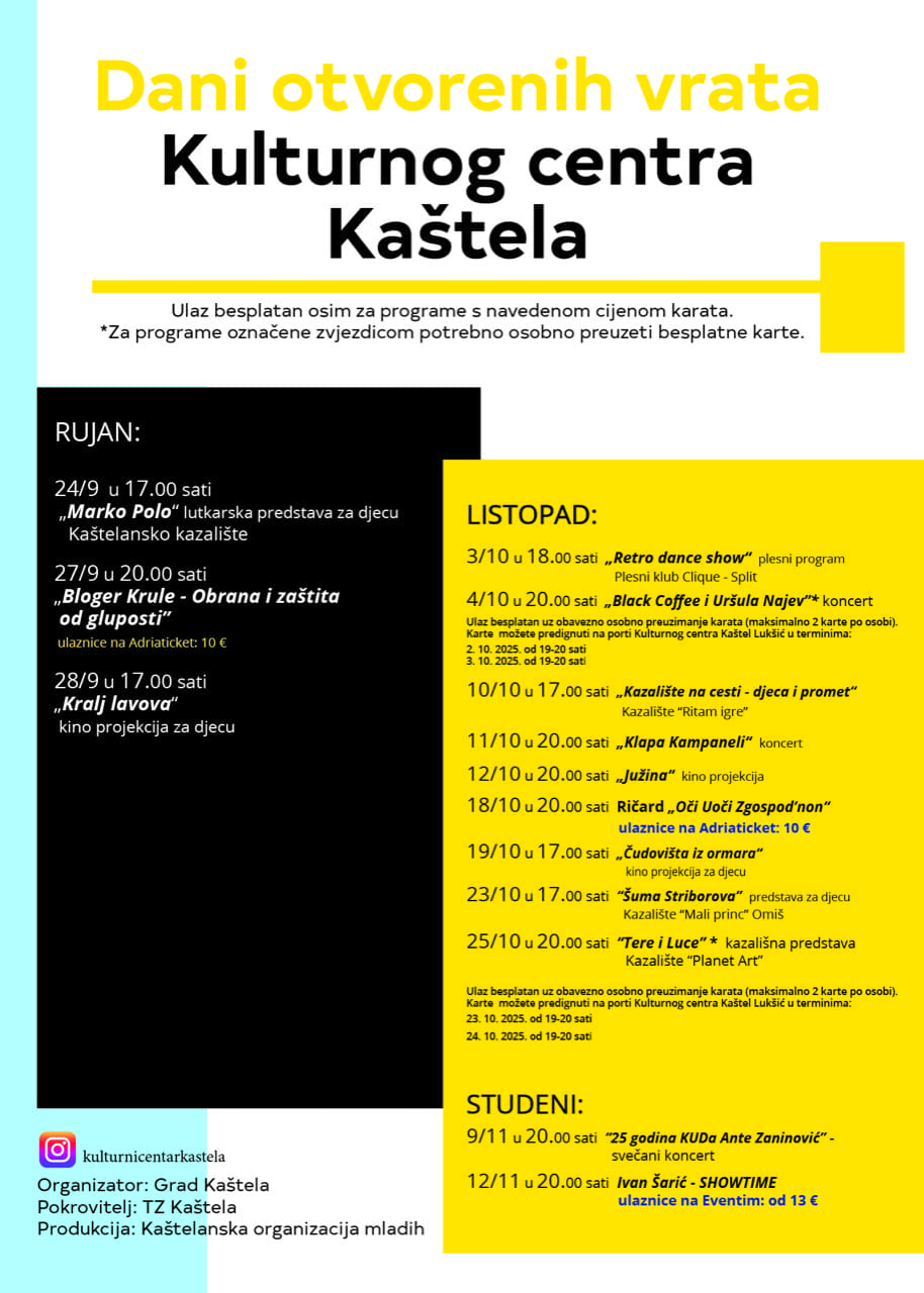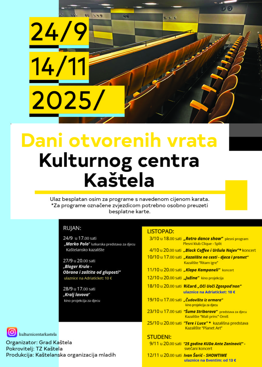 Bivši Pastoralni centar u Kaštel Lukšiću doživio je svoju rekonstrukciju, pa danas Kaštela imaju impozantnu građevinu koja je namijenjena za razna kulturna događanja. Ove jeseni u Kulturnom centru Kaštela nas očekuju "Dani otvorenih vrata" koji će se održati od 24. rujna do 12. studenog. U tom periodu posjetitelji će moći uživati u raznim predstavama, kino projekcijama, koncertima, izložbama kako domaćih udruga tako i gostujućih. Moramo napomenuti kako je većina događanja besplatna, a neka uz simboličnu nadoplatu. Program događanja danas su medijima predstavili gradonačelnik Kaštela Denis Ivanović, direktorica TZ Kaštela Nada Maršić te producentica Marijana Vulas.