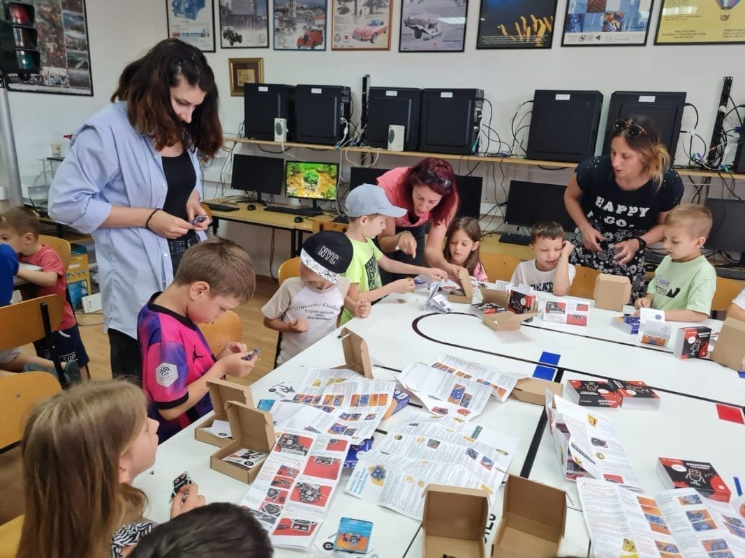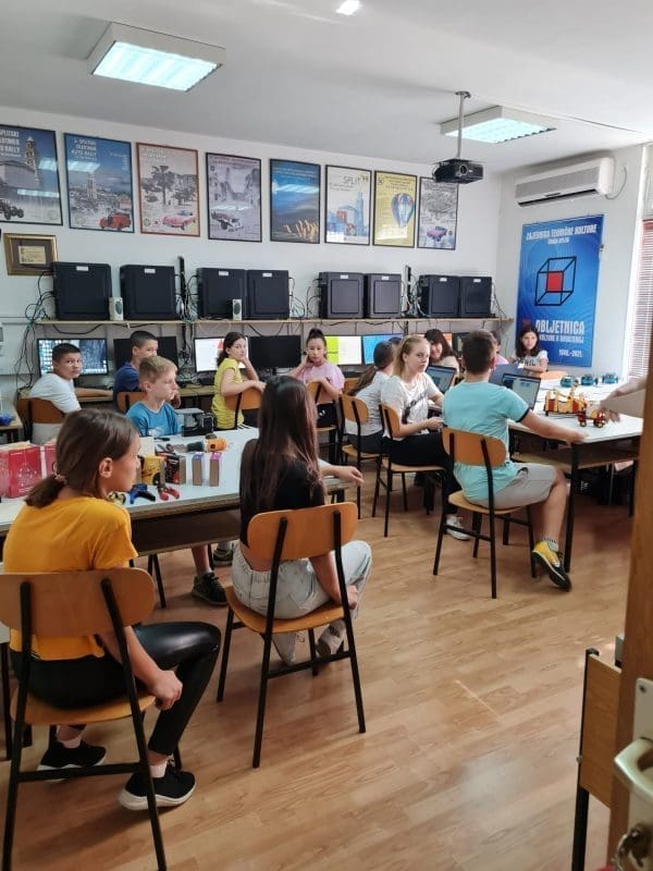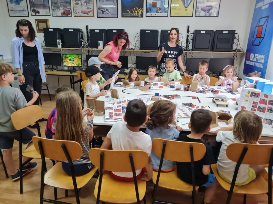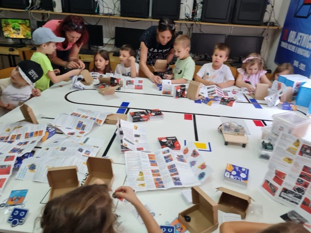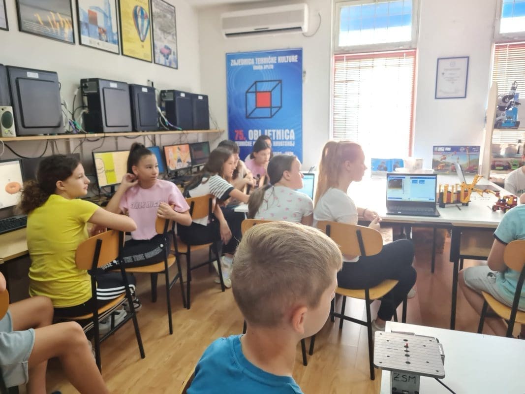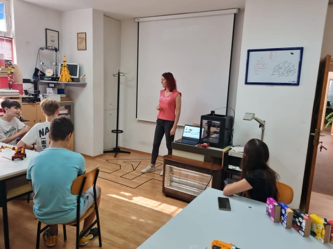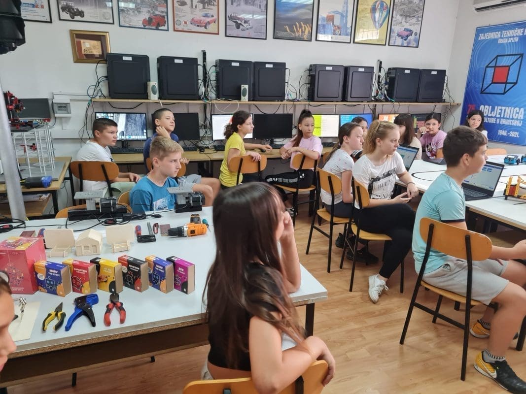 Odmah ujutro održana je prva radionica robotike, u sklopu isplaniranih aktivnosti. Na radionici robotike sudjelovalo je šesnaest učenika šestog razreda osnovne škole Kman-Kocunar, zajedno sa svojom nastavnicom, Blankom Runtić. Učenike se prvo upoznalo s općenitim radom Zajednice, njenih Udruga članica i aktivnostima kojima se svi zajedno bavimo. Potom su učenicima prezentirani mBot 1, mBot 2 i mBot Ranger, Fischertechnik setovi, micro:bit, Arduino student starter kit, CircuitMessovi Wacky robots, Unimati i alati za obradu šperploče, primjeri maketarskih radova, 3D printer itd. Potom su učenici sami okušali rad robotom mBot2 - u programu mBlock samostalno su isprogramirali kratke kodove, prenijeli kodove na robote te upravljali njima na željeni način.