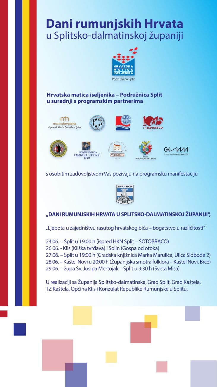 U organizaciji Hrvatske matice iseljenika – Podružnice Split, od 24. do 29. lipnja 2025. godine Splitsko-dalmatinska županija domaćin je kulturno-identitetske manifestacije „Dani rumunjskih Hrvata“. Programi se održavaju u Splitu, Kaštelima, Solinu i Klisu, a donose raznoliku prezentaciju bogate baštine hrvatske zajednice iz Rumunjske, jedne od najstarijih i najpostojanijih hrvatskih manjinskih zajednica u Europi.