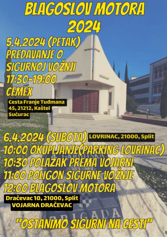 Edukativno predavanje, poligon sigurne vožnje i blagoslov motora organiziranju BMW MK Dalmacija, MK Vuk Samotnjak, MK 4. Gardijska, MK Specijalne policije, MK Fjaka uz potporu MUP-a Splitsko-dalmatinske županije i tvrtke Cemex.