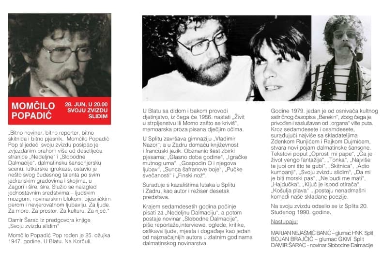 Druga večer posvećena je neponovljivom splitskom novinaru, kazališnom režiseru, kazališnom piscu, kritičaru, skitnici, boemu, nadasve pjesniku - Momčilu Popadiću. Momčilo je "za svojon zvizdon" otiša' u četrdeset drugoj godini, ostavivši iza sebe čitav svemir.
