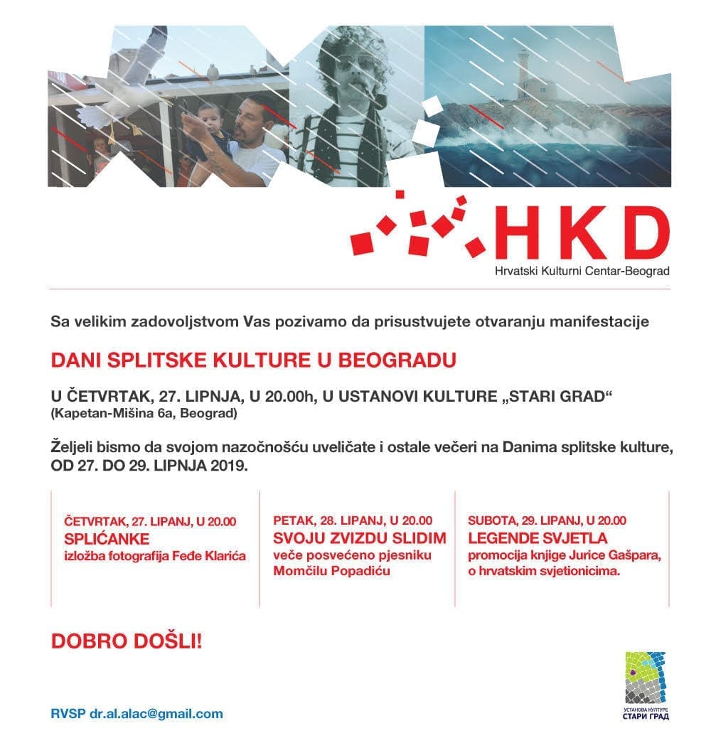 U Beogradu će se od 27. do 29. lipnja održati "Dani splitske kulture u Beograd". Svečano otvaranje je u Ustanovi kulture "Stari grad" u četvrtak, 27. lipnja, u 20 sati. Događaj organizira Hrvatski kulturni centar Beograd.
