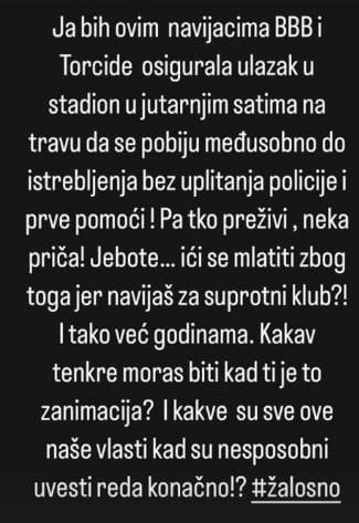 "Ja bih ovim navijačima BBB i Torcide osigurala ulazak u stadion u jutarnjim satima na travu da se pobiju međusobno do istrebljenja bez uplitanja policije i prve pomoći! Pa tko preživi, neka priča! Ići se mlatiti zbog toga jer navijaš za suprotni klub?! I tako već godinama. Kakav kreten moraš biti kad ti je to zanimacija? I kakve su sve ove naše vlasti kad su nesposobni uvesti reda konačno? Žalosno", napisala je.