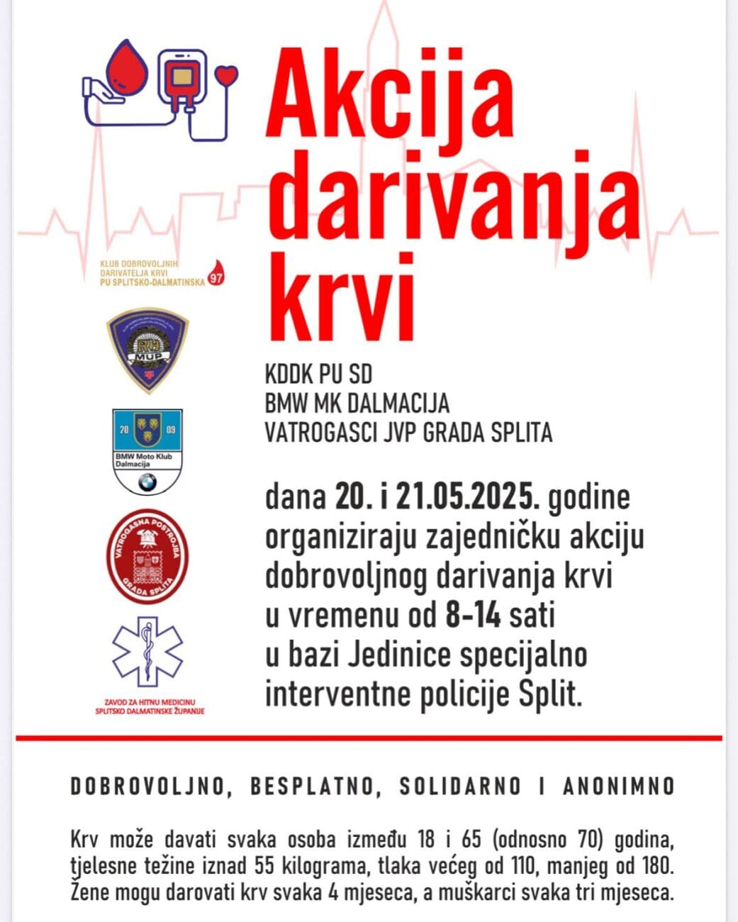 U ponedjeljak i utorak, 20. i 21. svibnja 2025. godine, u Splitu će se održati zajednička akcija dobrovoljnog darivanja krvi koju organiziraju Klub dobrovoljnih darivatelja krvi Policijske uprave splitsko-dalmatinske, BMW Moto Klub Dalmacija, Vatrogasci JVP Grada Splita i Zavod za hitnu medicinu Splitsko-dalmatinske županije.