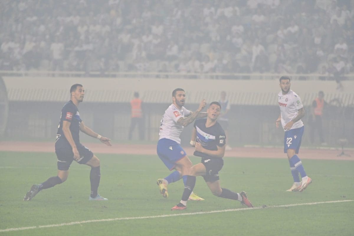 Mierez je iz slobodna udarca pogodio samo živi zid, a u Jovićevu se knjižicu kartoniranih upisao i Gržan. U 34. je nakon oštra ubačaja Trajkovskog Jović reagirao na Mierezovo kratkotrajno bolovanje pa je propala i ta prilika. U 40. je nakon duge akcije Hajduka signaliziran Pukštasov prekršaj na Nejašmiću. Mierez je u 45. minuti dramatično pao na travnjak držeći se za lice, doduše, pogrešno je odglumio, bijedan kontakt sa Šarlijom odvio se na rubu dresa, a taj je oskarovski nastup ujedno bio zadnja scena u prvome dijelu koji je završio s 0:0.
