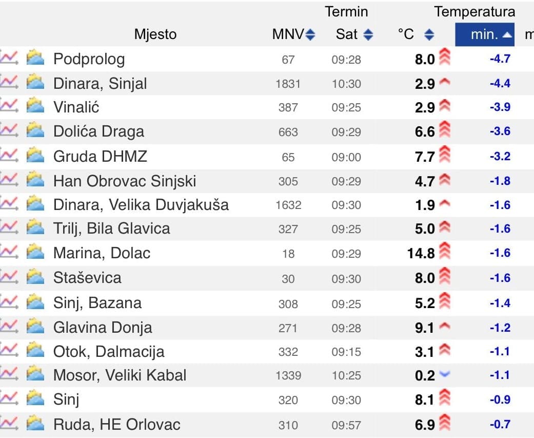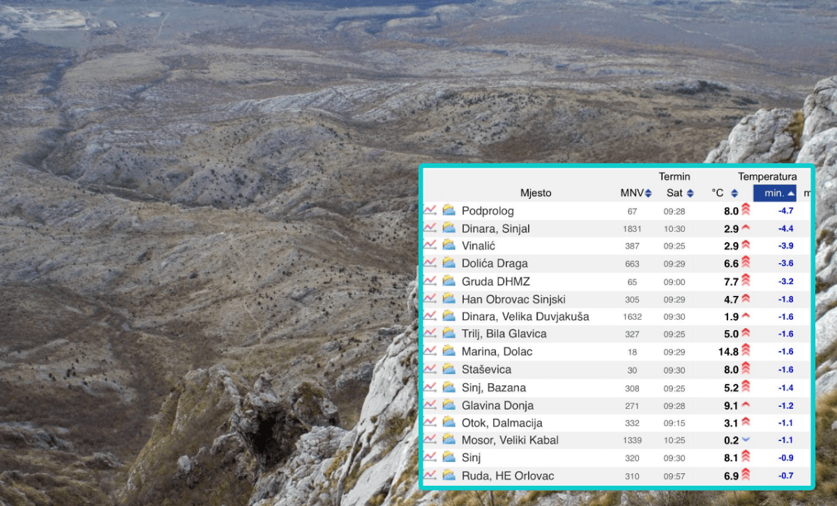 Temperature zraka u Dalmaciji jutros su na nekim područjima otišle u minus i to po četiri stupnja ispod ništice. Jutrošnji rekorder je Podprolog u sastavu grada Vrgorac gdje se u 9:30 smrzavalo na gotovo pet stupnjeva ispod nule.