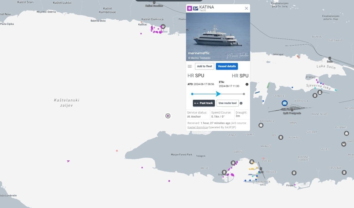 Kako se doznaje, radi se o Brodosplitovoj jahti Katina, izgrađenoj u Splitu. Uz nju, u vlasništvu Brodosplita su Klara, Moet i Golden horizont. Jahta namijenjena najmu tijekom cijele godine, a već je četvrti dan usidrena ispred lučice Spinut.