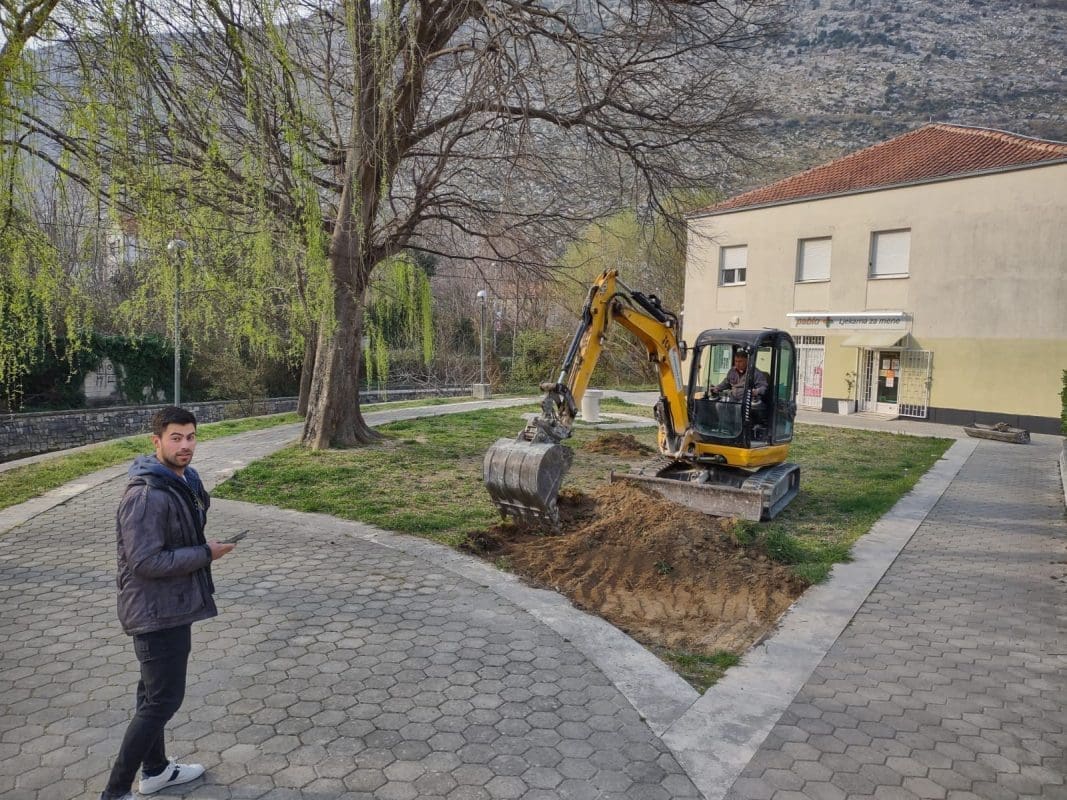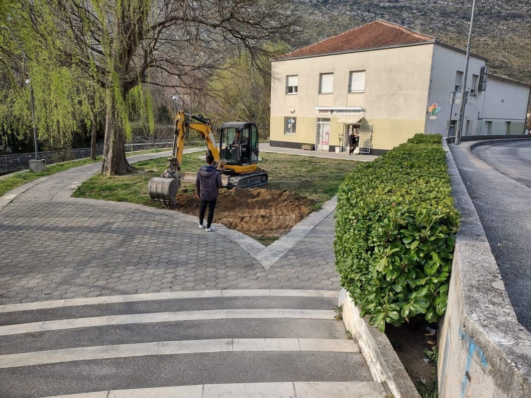 Kamene ploče će se postavljati na cementni malter koji će se izdvojiti na šljunčani sloj, a vez kamenog popločanja je 30cm x slobodno. Posotojeća fontana i stablo će se zadržati. Na posljetku slijedi dodatno osvjetljavanje nove popločane površine i stabla. U planu je i odvodna oborinski voda i to prirodnim padom na pstojeći zeleni pojas koji je u kontaktu s popločanom površinom.