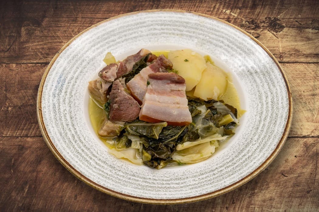 Zagrijati lonac s vodom, ubaciti predhodno oprano suho meso i kuhati 1 sat i 30 minuta. Kada je meso kuhano izvaditi ga i narezati. U ostatak vode ubaciti narezani krumpir i raštiku te dodati svinjsku mast i sol. Kuhati 20 minuta. Prilikom serviranja zaliti maslinovim uljem.