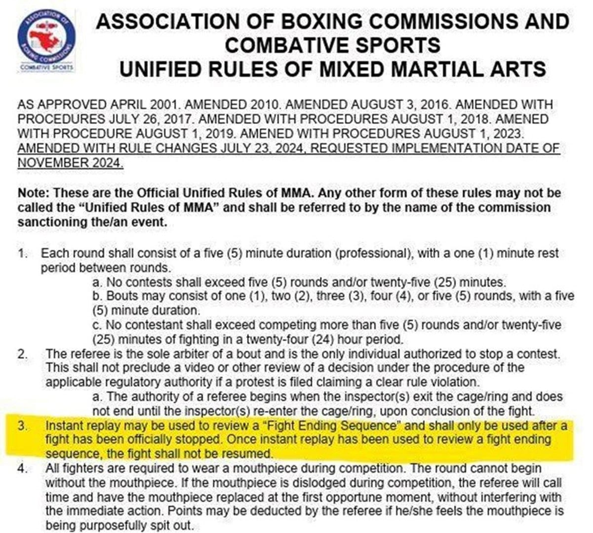 Kao što se vidi iz priloženih pravila MMA-a, članak tri objašnjava: "Snimka može se koristiti za pregled ‘završne sekvence borbe‘ i smije se upotrijebiti samo nakon što je borba službeno zaustavljena. Nakon što je snimka korištena za pregled završne sekvence borbe, borba se ne smije nastaviti."