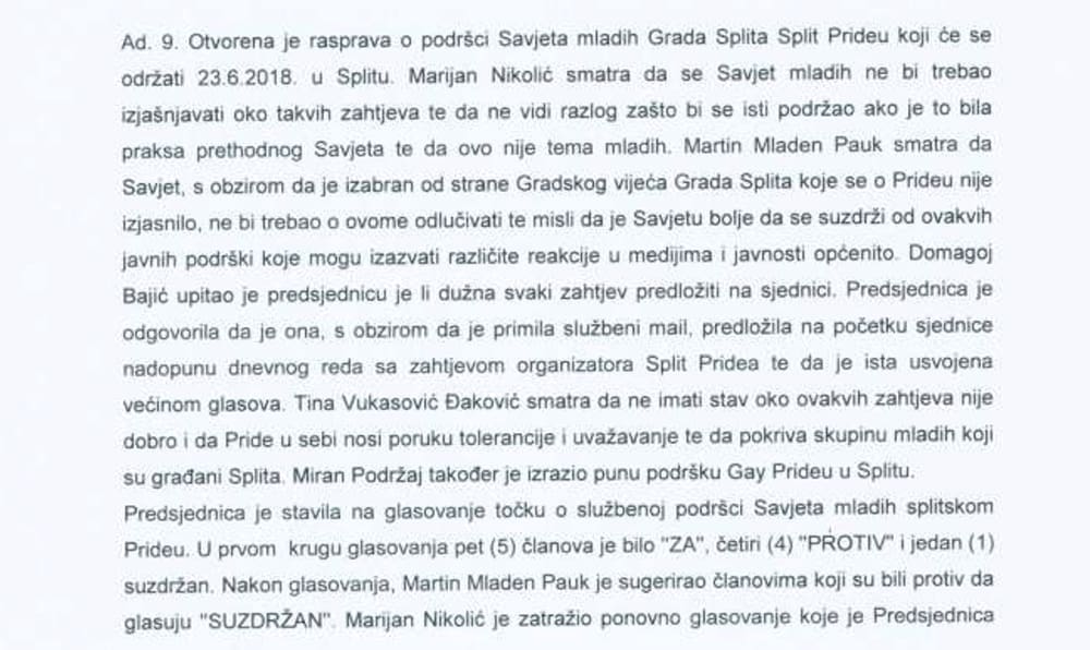 Nedavno objavljen zapisnik 4. sjednice Savjeta mladih grada Splita, održane 18. lipnja, otkrio je interesantan događaj o kojem se sve do danas šutjelo. Na prijedlog Split Pridea članovi Savjeta glasali su o podršci Povorci ponosa u Splitu koja se održavala desetak dana nakon sjednice.