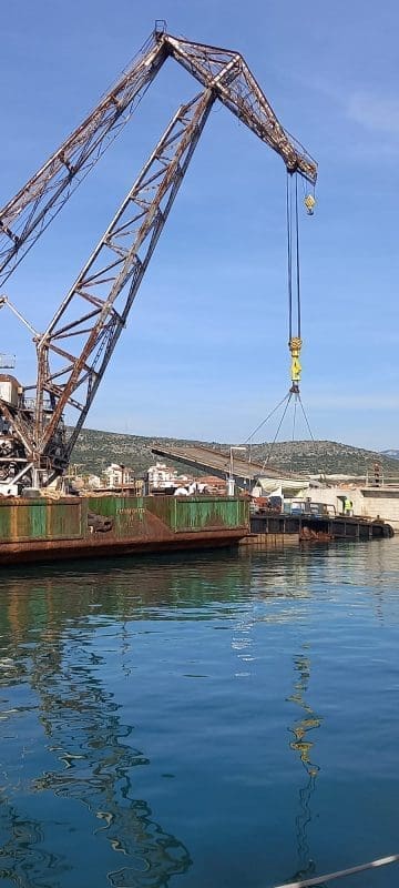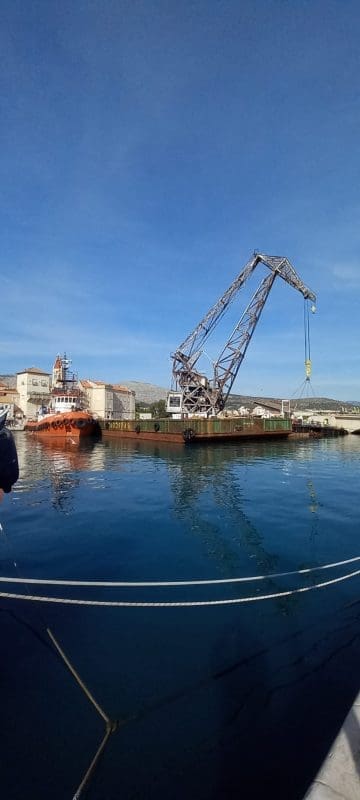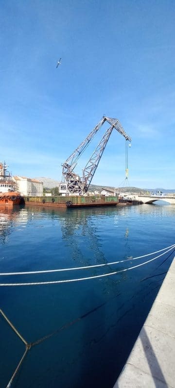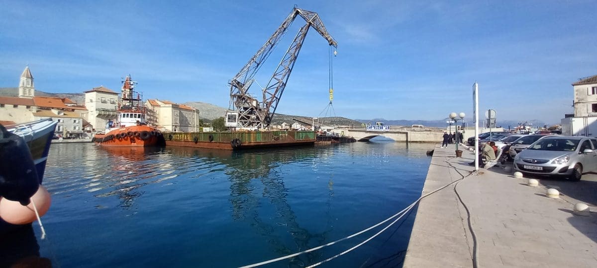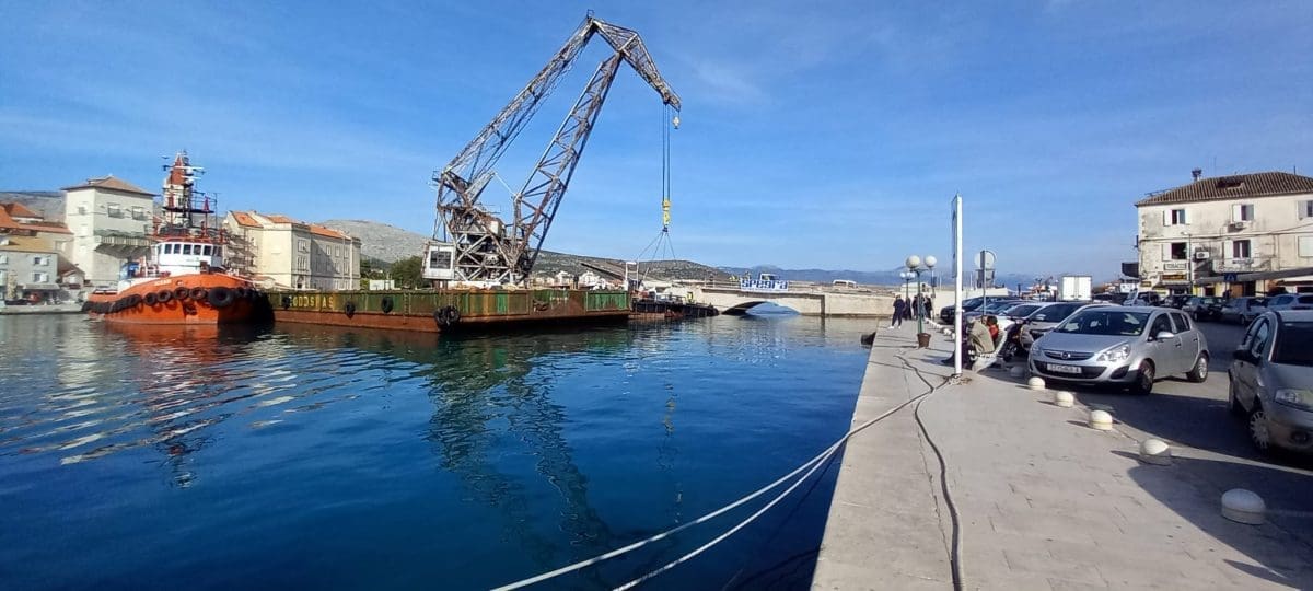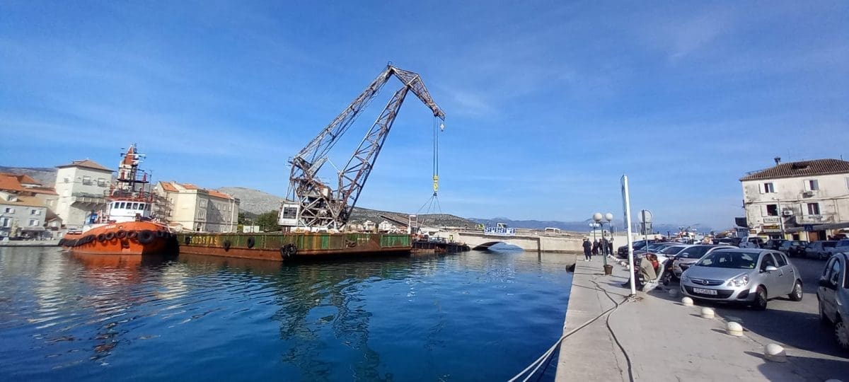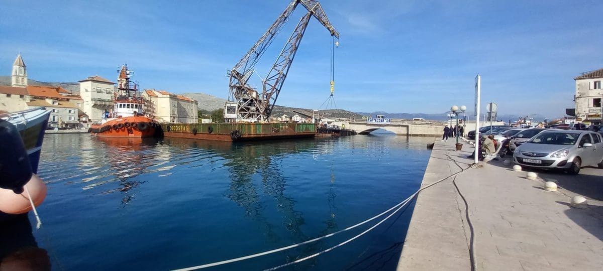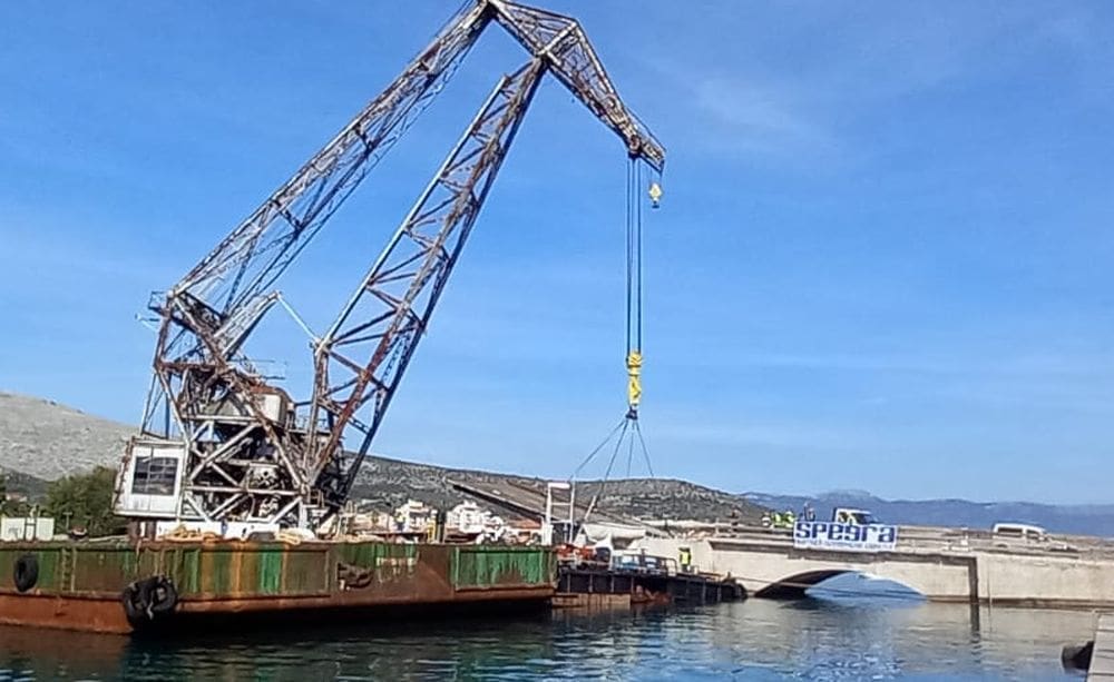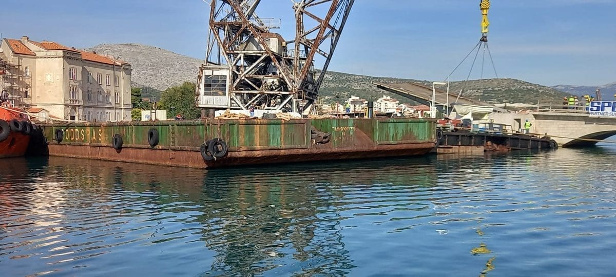 Danas je stigla plovna dizalica i barža za prijevoz konzolnog čeličnog dijela starog mosta u Trogiru. Ukoliko sve bude u skladu planirane dinamike očekuje se oslobađanje plovnog puta u zoni mosta u naredna dva dana, javljaju iz Hrvatskih cesta.