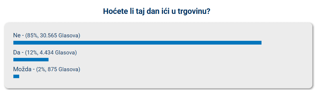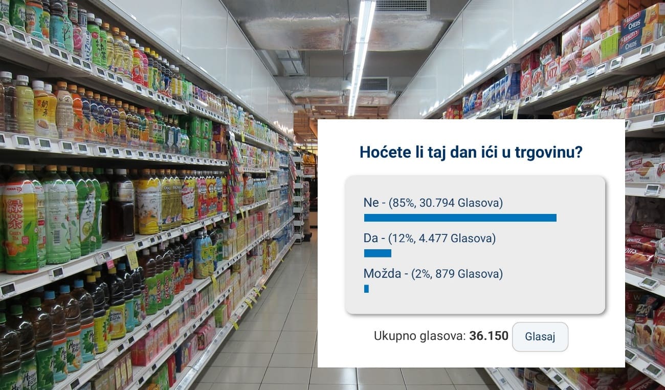 Tisuće Splićana sutra neće ići u dućane mješovitom robom. U anketi koju je provela Dalmacija Danas sudjelovalo je više od 35 tisuća ljudi i čak 85% njih izjasnilo se da će sutra bojkotirati dućane. 12% ispitanih kaže da neće sudjelovati u bojkotu, a još uvijek nije odlučilo njih 2%.