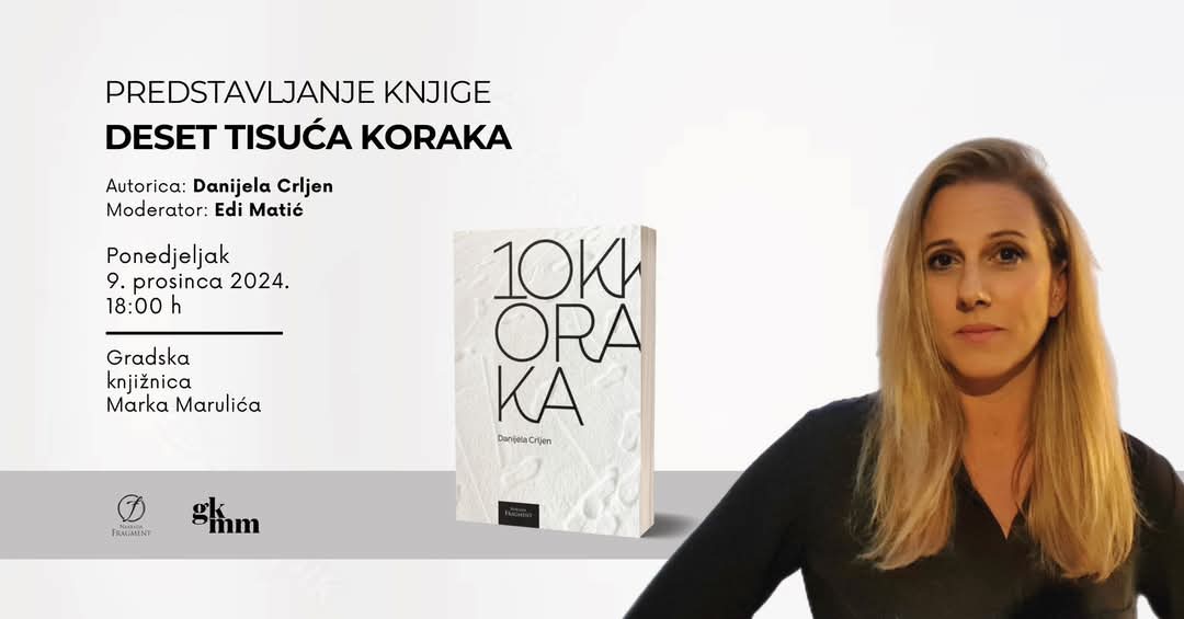 Nakon svog prvog romana "Strah od kupine", Danijela Crljen ponovno oduševljava čitatelje novim djelom. Njezin drugi roman, "Deset tisuća koraka", koji je objavila Naklada Fragment, bit će predstavljen u Splitu u ponedjeljak, 9. prosinca 2024. godine, u 18:00 sati, u Gradskoj knjižnici Marka Marulića.