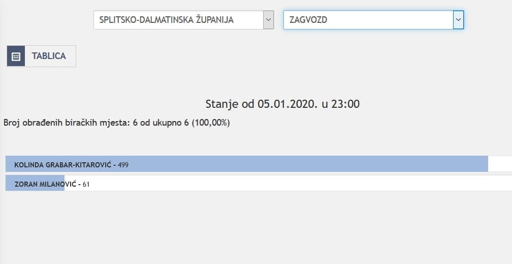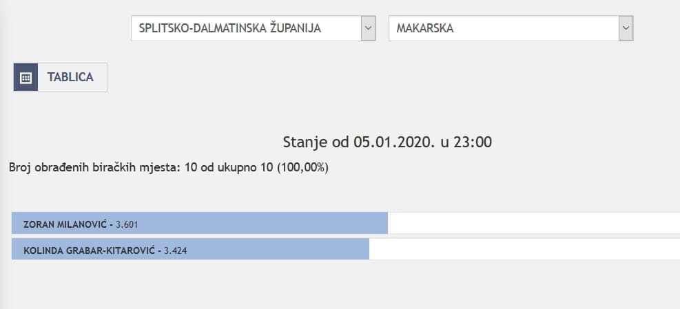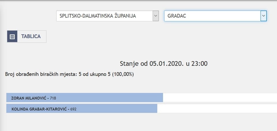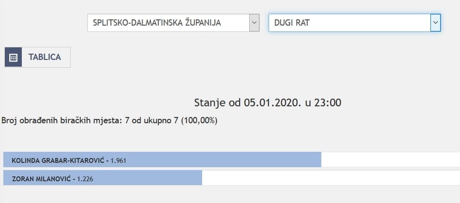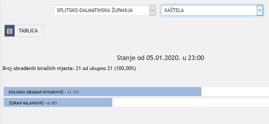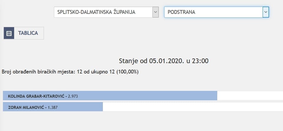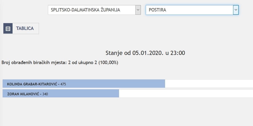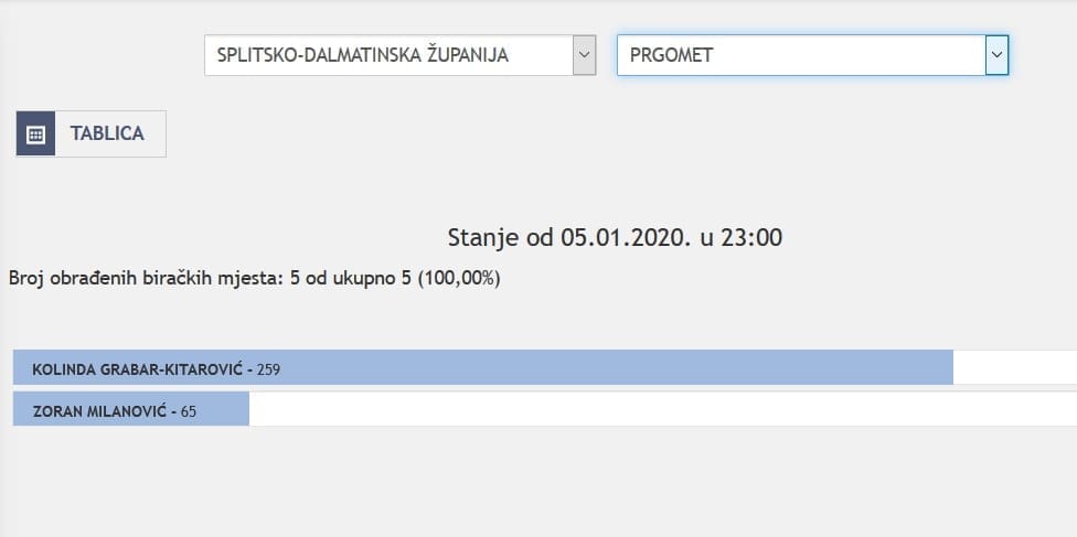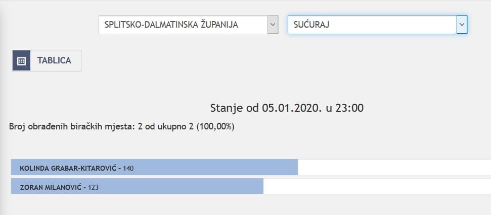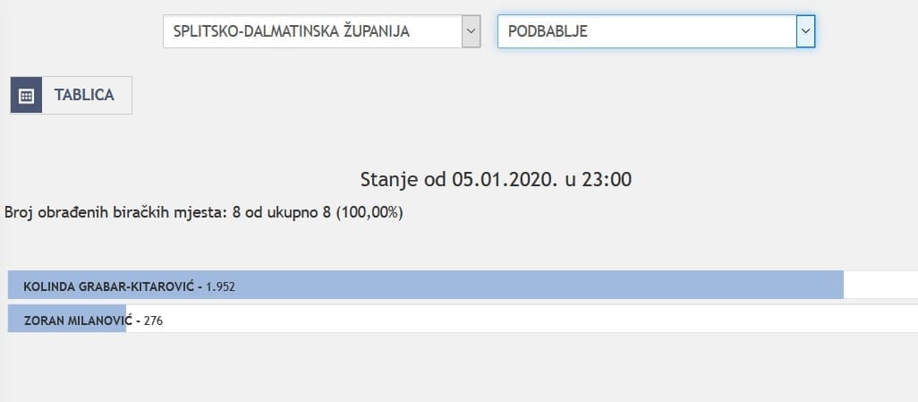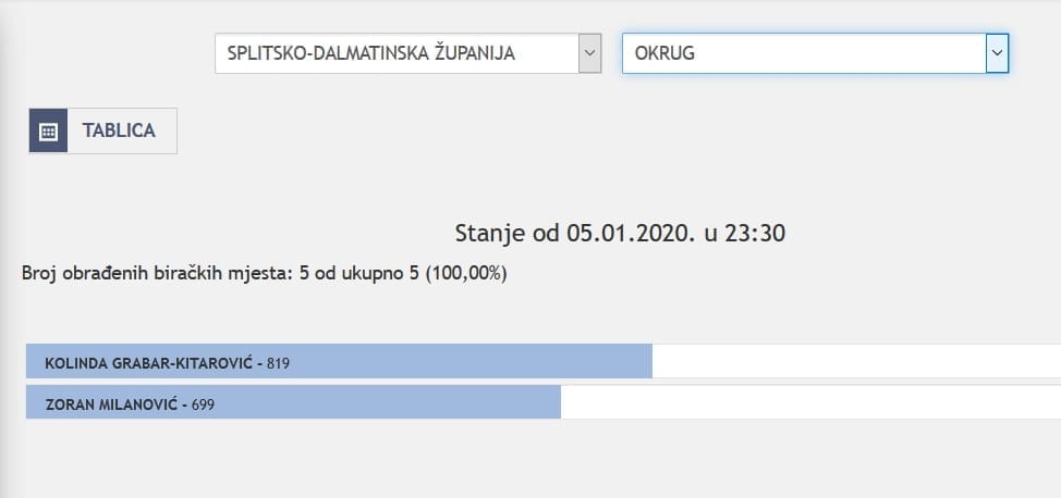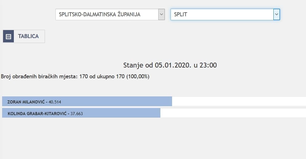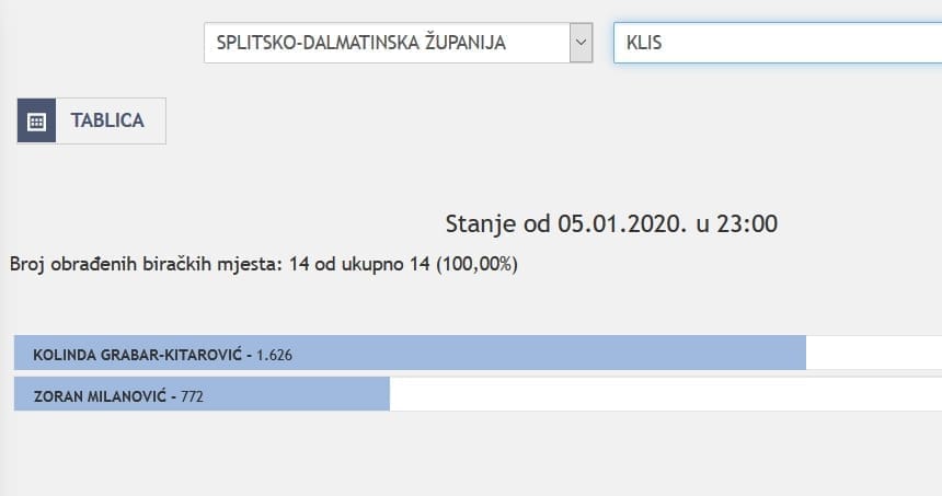 U Splitsko-dalmatinskoj županiji najviše je glasova osvojila Kolinda Grabar Kitarović. Nakon što su obrađena sva glasačka mjesta, Kolinda je osvojila 121.975 glasova, a Zoran Milanović 87.503 glasa.