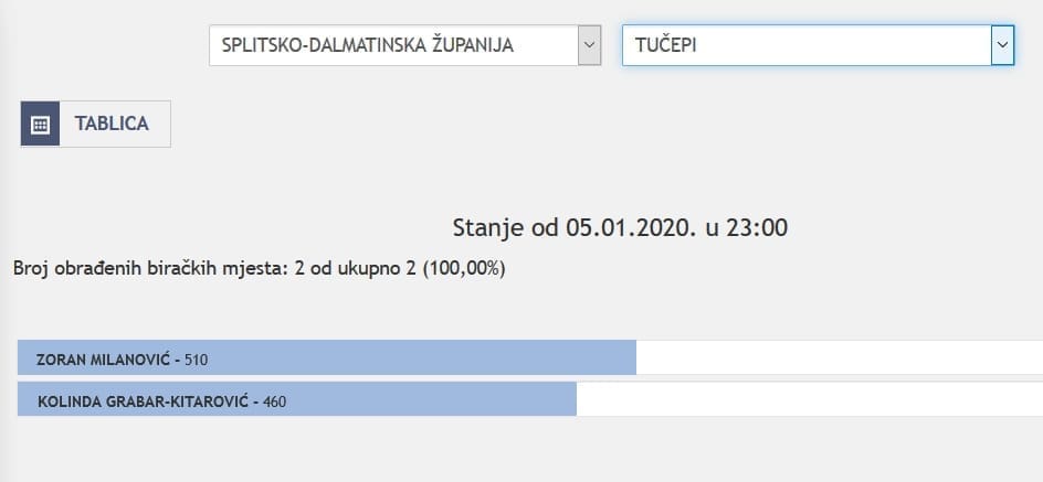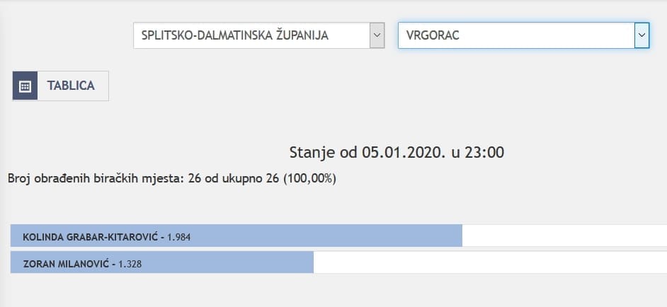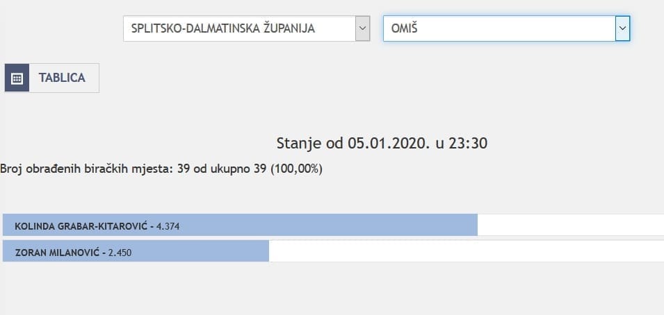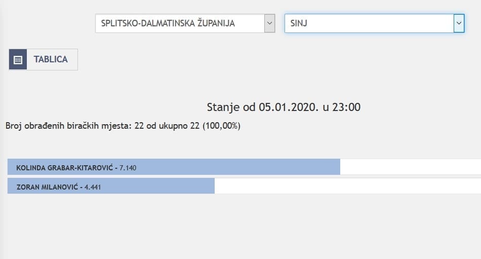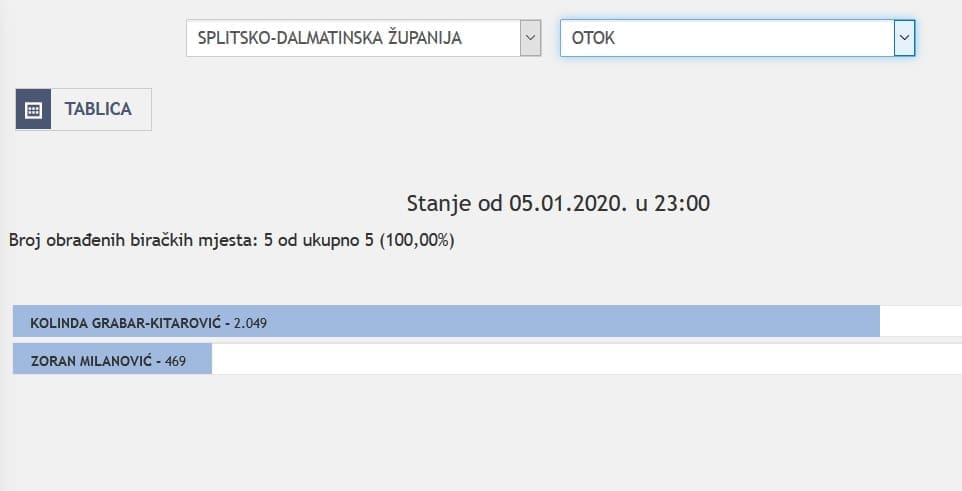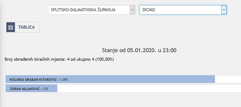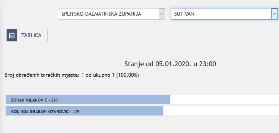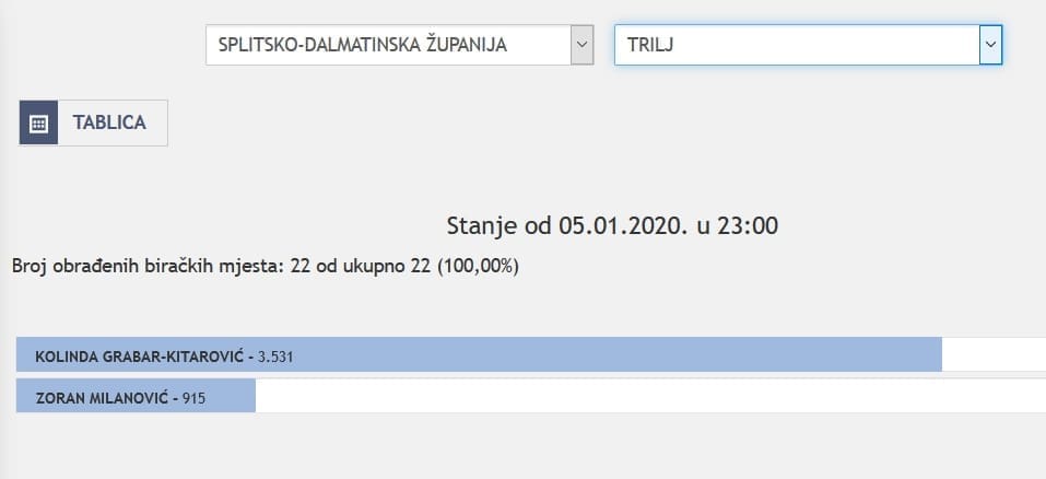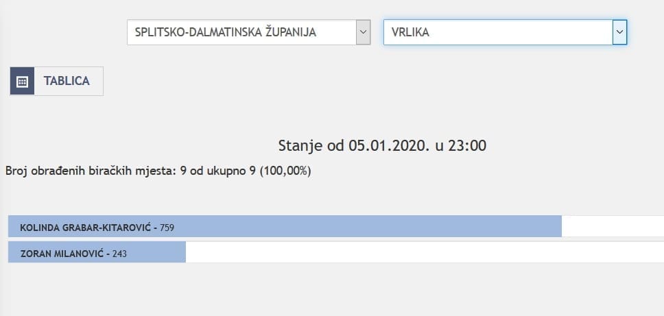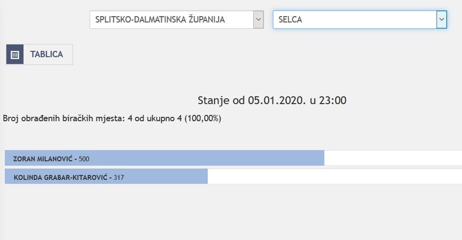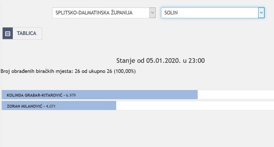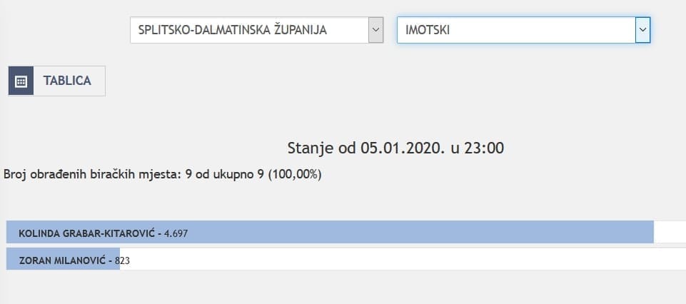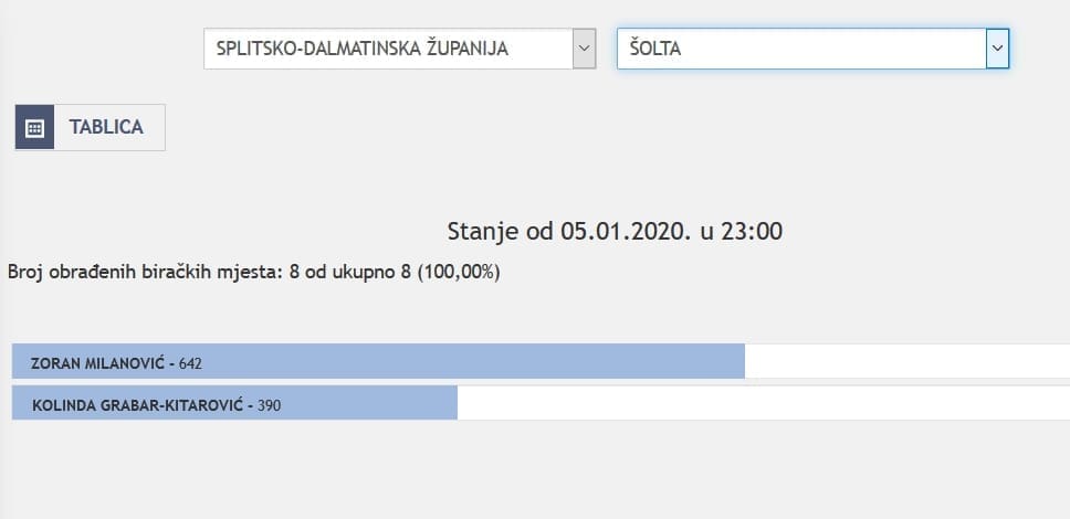 U Splitsko-dalmatinskoj županiji najviše je glasova osvojila Kolinda Grabar Kitarović. Nakon što su obrađena sva glasačka mjesta, Kolinda je osvojila 121.975 glasova, a Zoran Milanović 87.503 glasa.
