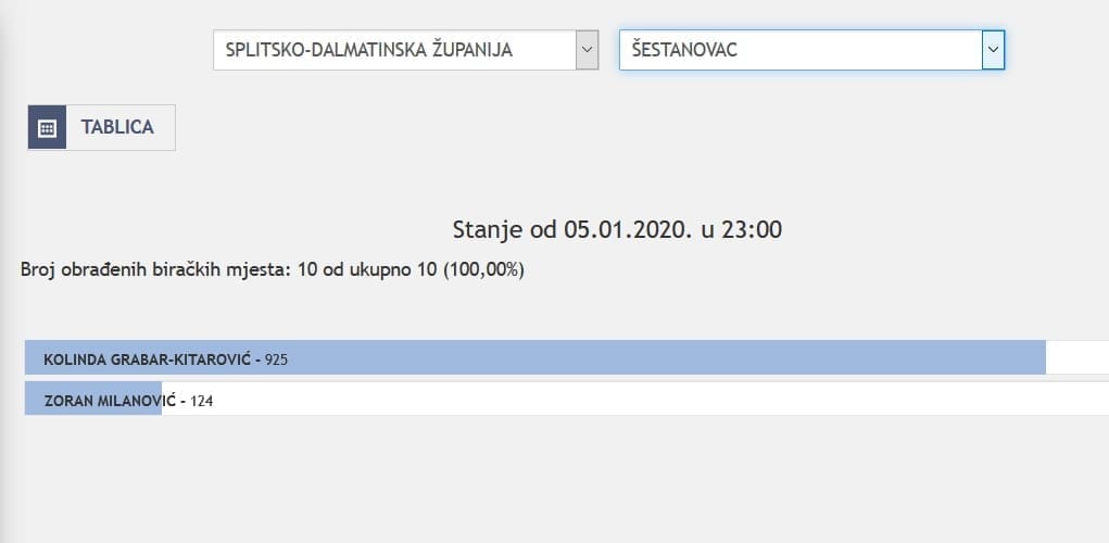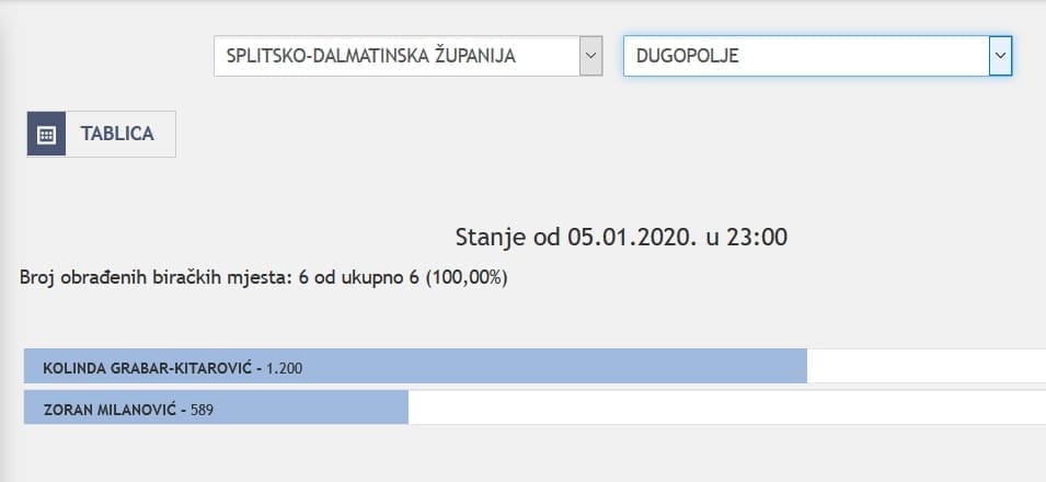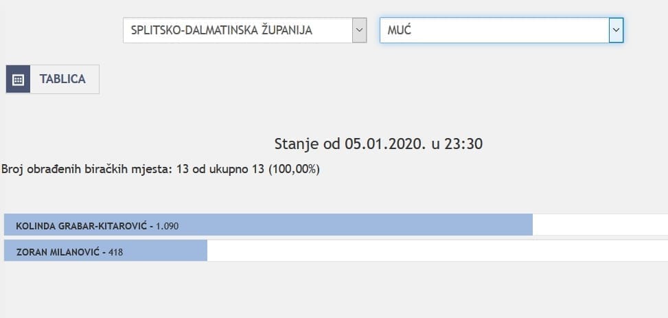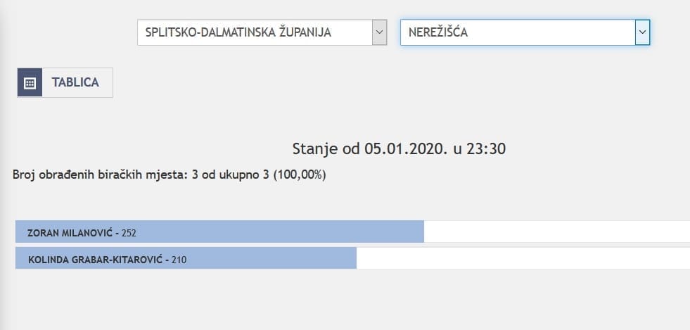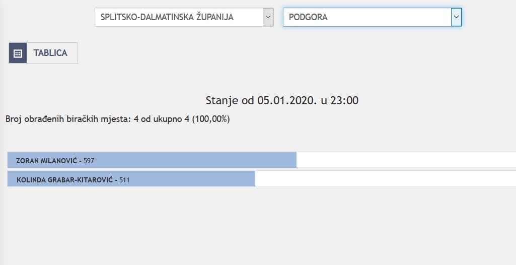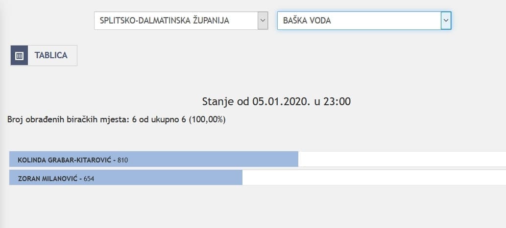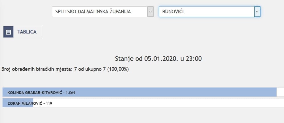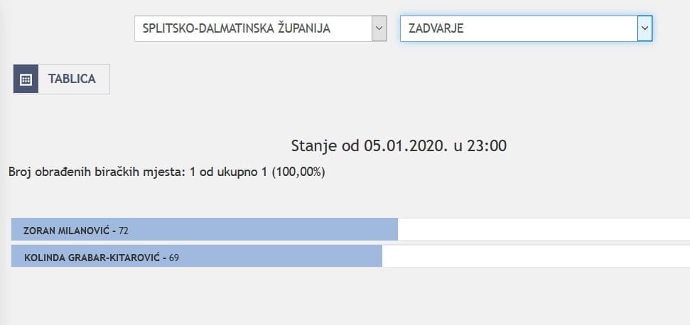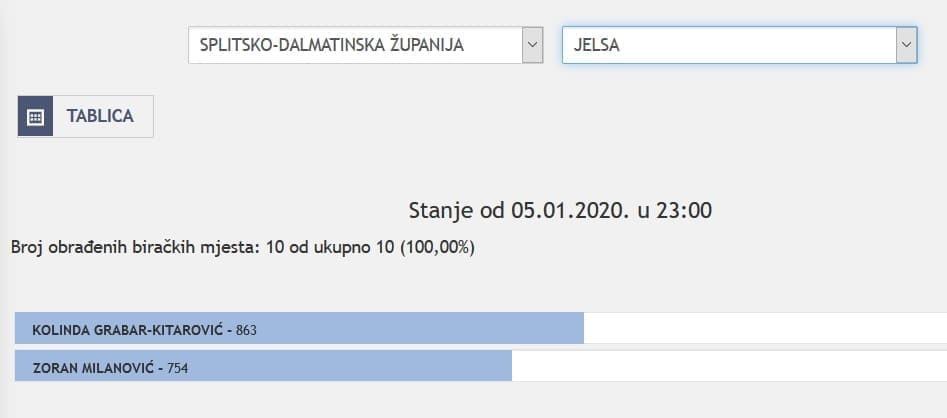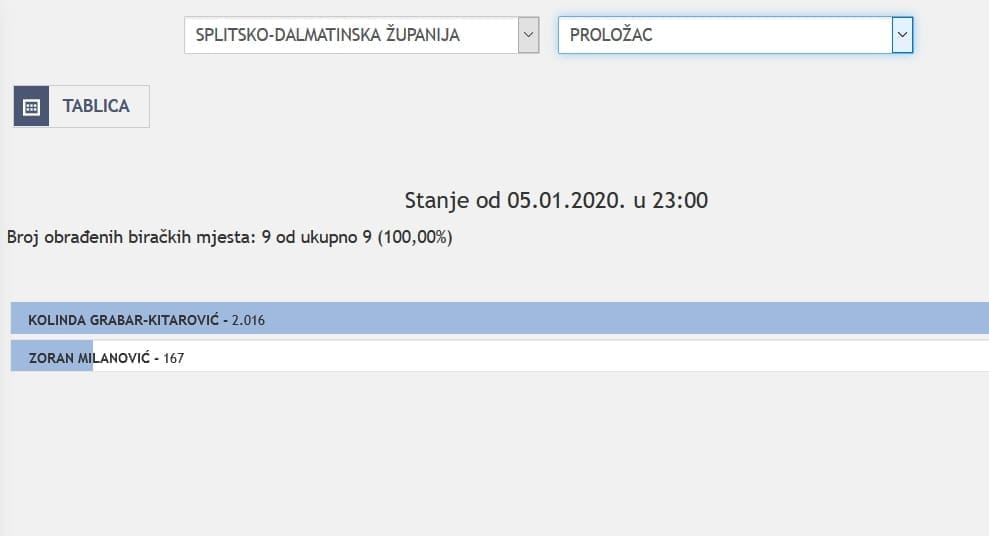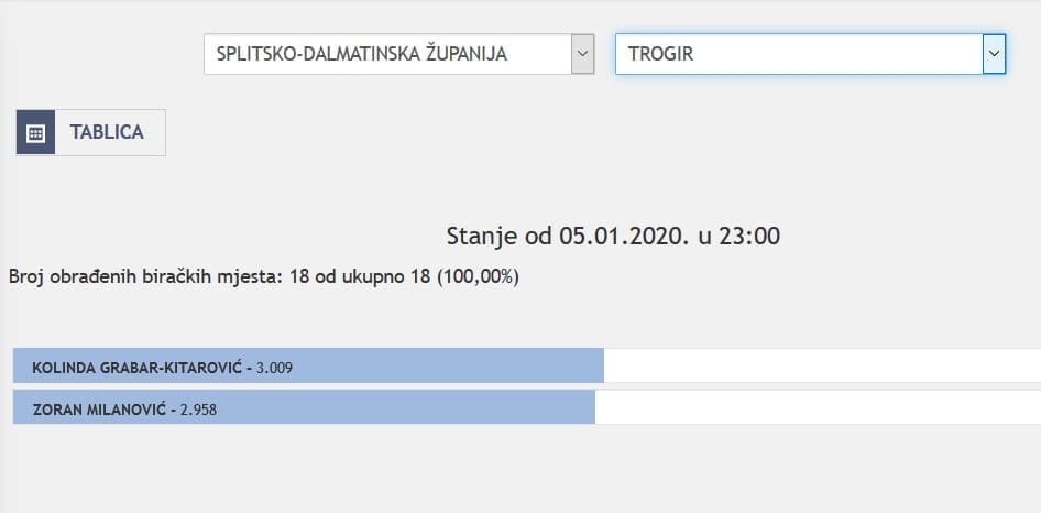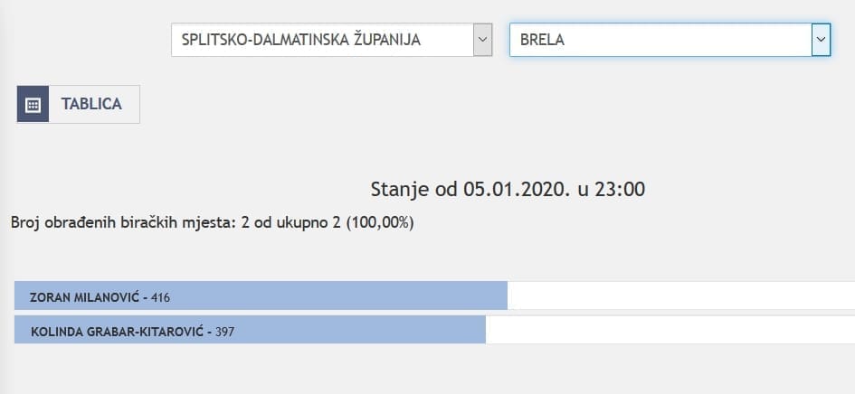 U Splitsko-dalmatinskoj županiji najviše je glasova osvojila Kolinda Grabar Kitarović. Nakon što su obrađena sva glasačka mjesta, Kolinda je osvojila 121.975 glasova, a Zoran Milanović 87.503 glasa.