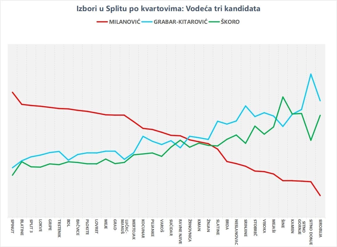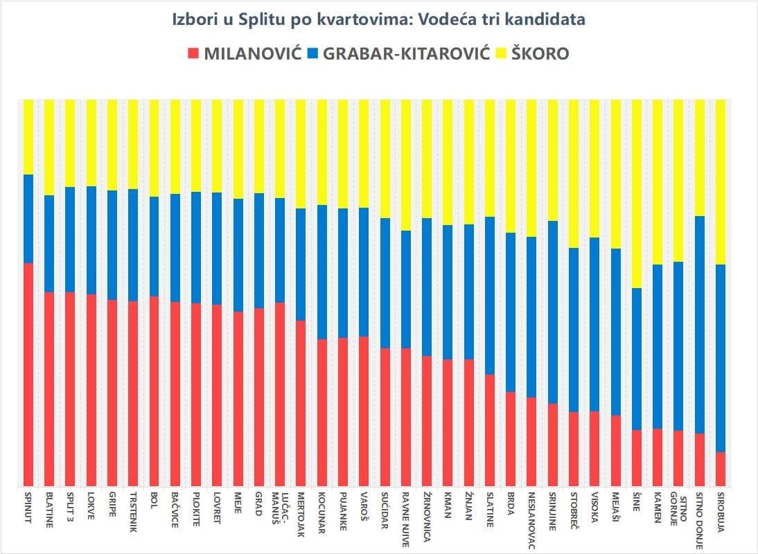 Tako je na Spinutu osvojio čak 43,31 posto, a preko 35 posto osvojio je u kvartovima Blatine, Split 3, Lokve, Gripe, Trstenik, Bol, Bačvice, Plokite, Lovret, Meje, Grad i Lučac- Manuš. Milanović je najlošije prošao na Sirbuji gdje je osvojio tek nešto više od 7 posto.