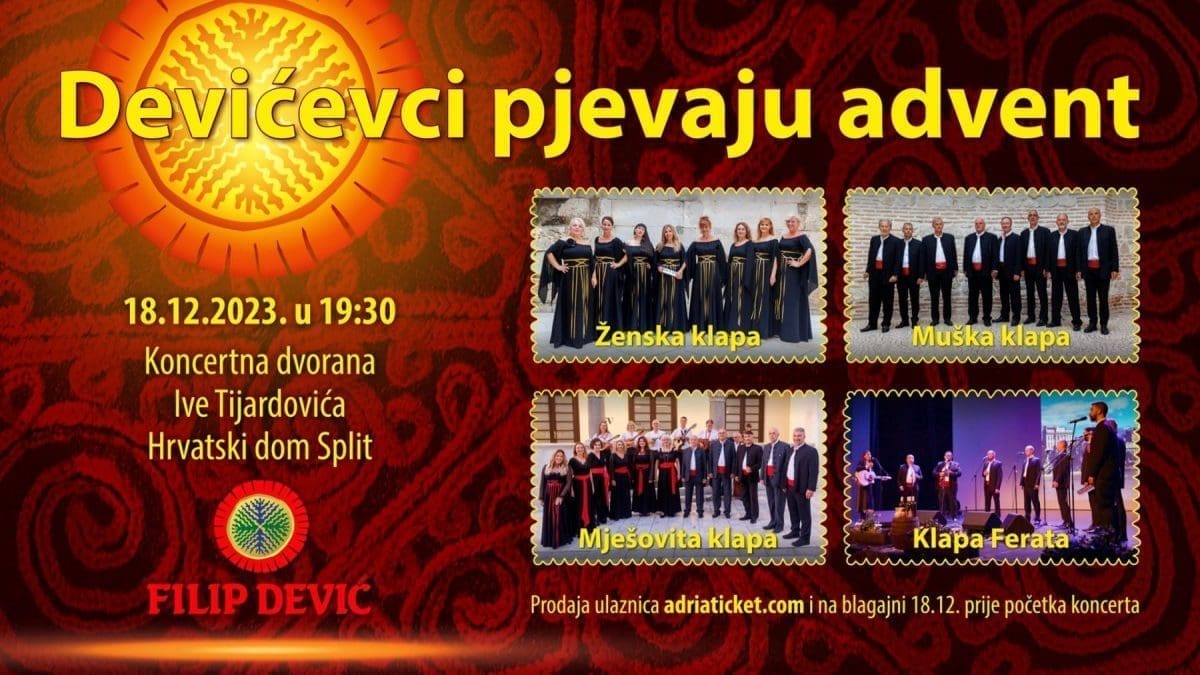 DEVIĆEVCI PJEVAJU ADVENT naziv je svečanog koncerta koji će se u ponedjeljak, 18. prosinca u 19:30 održati u Hrvatskom domu. Svima drage melodije u izvođenju muške, ženske, mješovite i klape „Ferata – Filip Dević” ispunit će velebnu Koncertnu dvoranu Ive Tijardovića.
