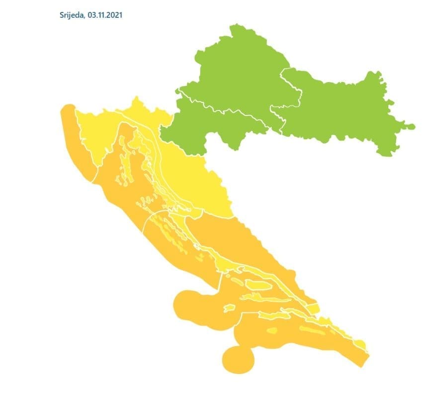 Stabilizacija vremena je samo prolazne naravi. Pred nama su dva najnestabilnija dana ovog tjedna. Tako će srijeda biti oblačna, povremeno uz kišu. DHMZ je već izdao narančasto upozorenje u Dalmaciji i to zbog juga do 95 km/h na moru, te zbog mogućih obilnijih oborina i grmljavine uz obalu i osobito u Zagori.