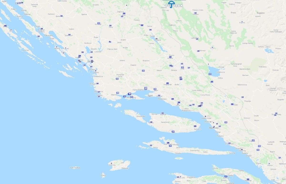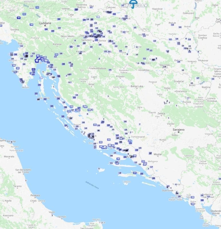 U Dalmaciji je najviše palo na Čiovu (Trogir), 78 litara, a slijede Dol (Hvar) 59, Korčula 57, Okruk Donji 53, Bol (Brač) 50, Poljica - Marina 47, Roglići - Biokovo 42, Ljubitovica 41, Kaštel Gomilica 38, Zadar 35, Milošići - Vrgorac 33, Solin 30 itd.