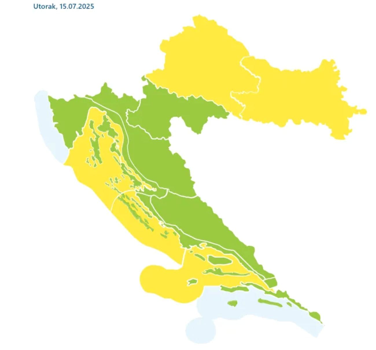 Ali i za utorak DHMZ izdao je žuto upozorenje za kontinentalnu Hrvatsku zbog potencijalno opasnog vremena. Moguće je grmljavinsko nevrijeme, mjestimice uz izraženije pljuskove i kratkotrajno jak vjetar, pri čemu najjači udari mogu dosezati i više od 65 km/h.