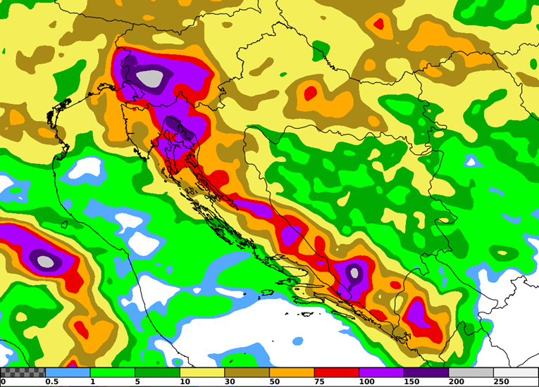 U takvoj situaciji, a prema trenutno dostupnim prognozama, ponovno treba biti spreman na ponegdje obilnu oborinu, osobito duž obale i krajevima uz Jadran (Slika 4) pri čemu će promjena vremena najprije zahvatiti zapad Hrvatske. Vrlo je vjerojatno da će lokalno pasti i više od 100 mm kiše, moguće i u kratkom periodu u obliku intenzivnih pljuskova s grmljavinom ili olujnih nevremena što može uzrokovati bujične i urbane poplave.