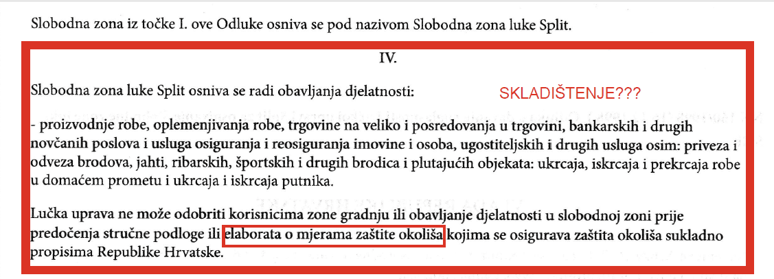 - Zašto se korisnicima Slobodne zone Split dozvoljava skladištenje tereta i robe, kad Lučka uprava Split nema suglasnost za obavljanje takve djelatnosti u Slobodnoj zoni, te isti korisnici nisu izradili Elaborat o mjerama zaštite okoliša? - stoji u uvodu priopćenja za medije kojeg potpisuje Ante Popović, prof., nezavisni vijećnik Splitsko-dalmatinske županije.