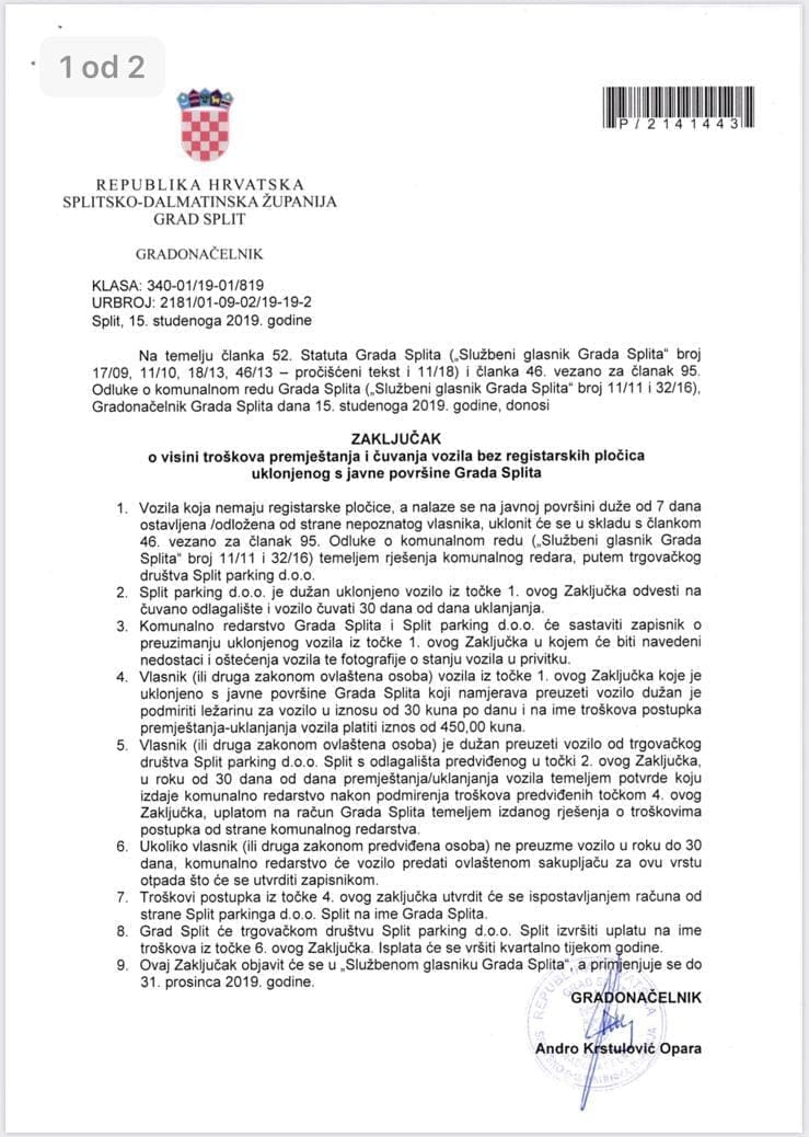 No, pravu zbunjozu izazvao je "Zaključak o visini troškova premještanja i čuvanja vozila bez registracijskih pločica uklonjenog s javne površine", objavljen 15. studenog u Službenom glasniku Grada Splita.