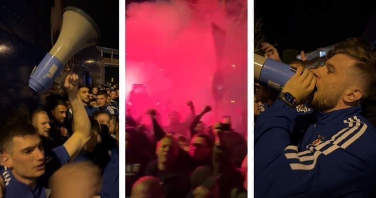 Nekoliko stotina Bad Blue Boysa, kojih je na Poljudu bilo oko 1500, pozdravili su igrače pjesmom i bakljama da bi u jednom trenutku Dominik Livaković preuzeo megafon i poveo poznate Dinamove pjesme. Uskoro mu se pridružio i Stefan Ristovski koji je urlao u megafon na oduševljenje svih okupljenih, a Livaković je onda pozvao trenera Igora Bišćana da izađe iz autobusa, piše Index.