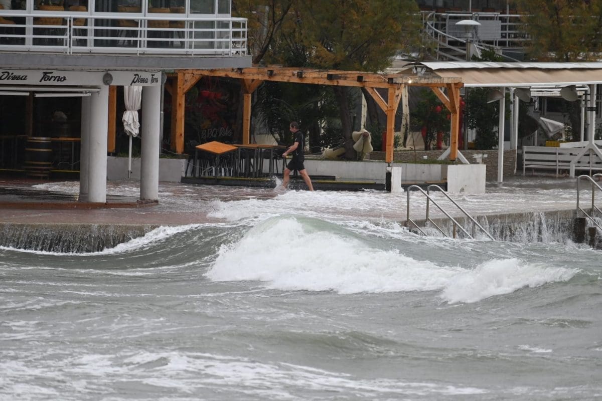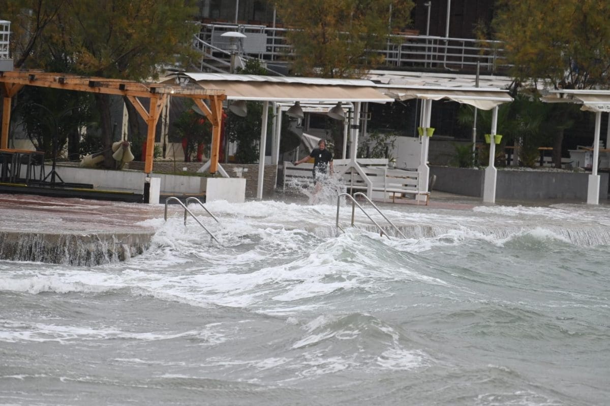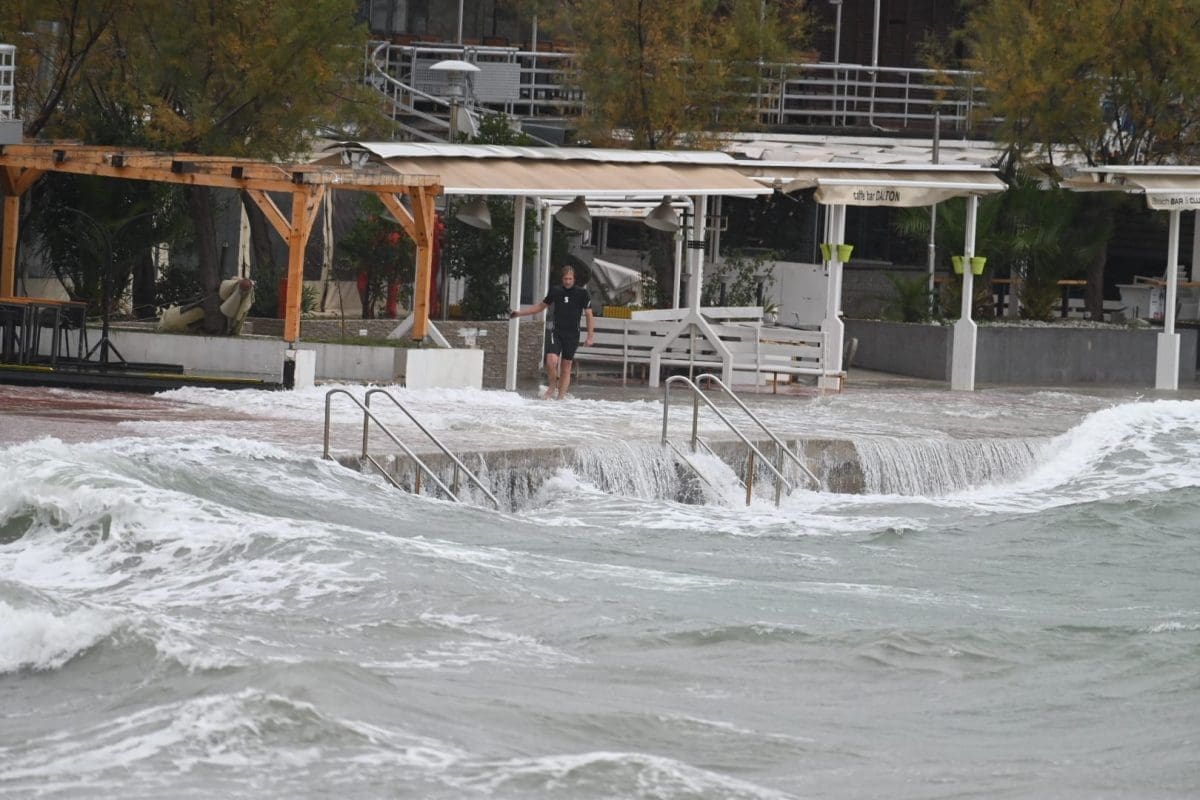 Pod vodom su se našli niži dijelovi obale, a ništa drugačije nije ni na splitskim Bačvicama gdje su šetnice i niži dijelovi obale pod morem. Na Bačvicama valovi i plima dižu valove do prvih štekata ugostiteljskih objekata, a jedan Splićanin nije propustio prošetati kroz valove i more.