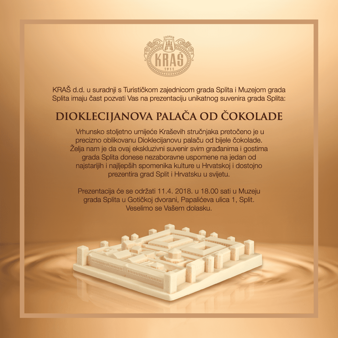 - Vrhunsko stoljetno umijeće Kraševih stručnjaka pretočeno je u precizno oblikovanu Dioklecijanovu palaču od bijele čokolade. Želja nam je da ovaj ekskluzivni suvenir svim građanima i gostima Splita donese nezaboravne uspomene na jedan od najstarijih i najljepših spomenika kulture u Hrvatskoj i dostojno prezentira grad Split i Hrvatsku u svijetu - najavili su iz Kraša.