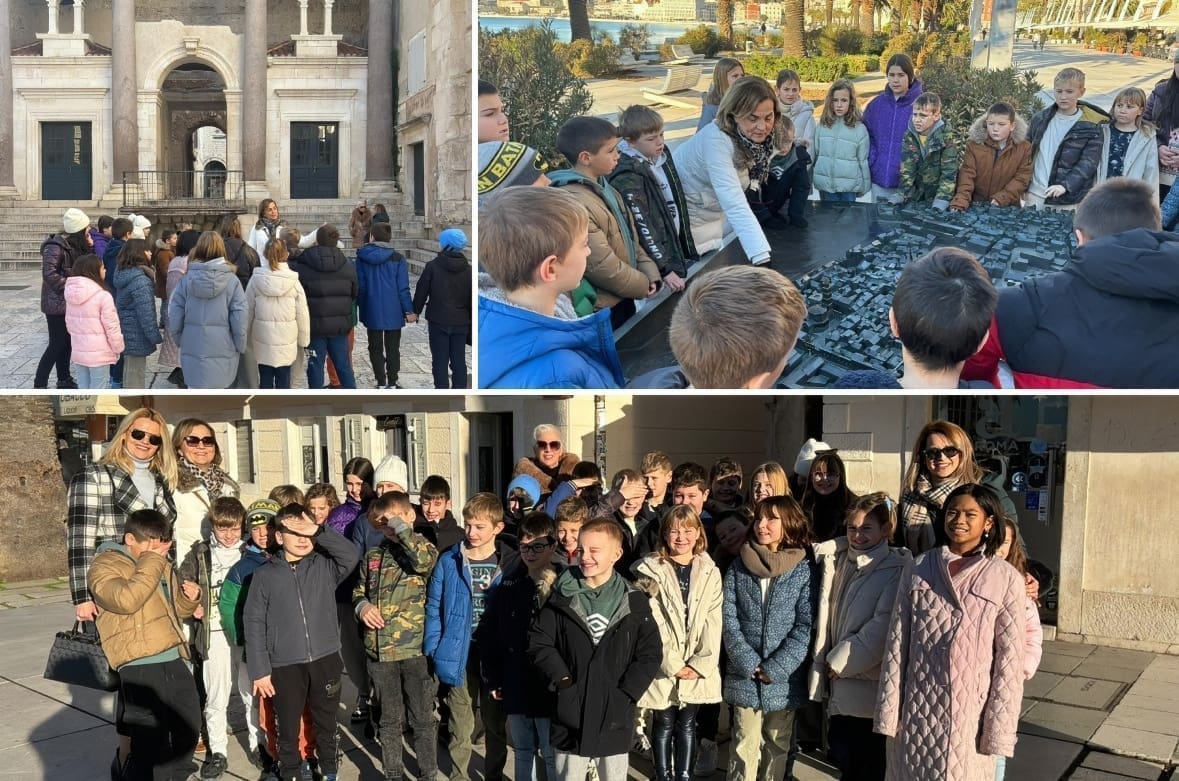 Prvi ovogodišnji razgled napravili su jutros trećaši škole Marjan, koji su grad obišli od makete grada na Rivi, pa kroz Mjedena vrata i Podrume, zatim do Peristila i Vestibula, katedrale sv. Dujma, Jupiterovog hrama, ulicom „Pusti me proć“, pa kroz Željezna vrata do Pjace, a preko Zlatnih vrata i ulicom Cardo vratili se na Peristil.