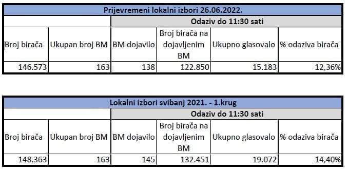 Prema informacijama Državnog izbornog povjerenstva do 11.30 sati izašlo je 12.36% birača. To je 2.04% manja izlaznost od izbora 2021. kada je do 11.30 sati izašlo 14.4%.