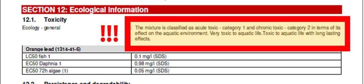 U sigurnosnom tehničkom listu nekih proizvođača navodi se kako je smjesa vrlo toksična za podvodni svijet. Proizvođači navode i kako je odlaganje potrebno izvesti u skladu sa lokalnim regulativama.