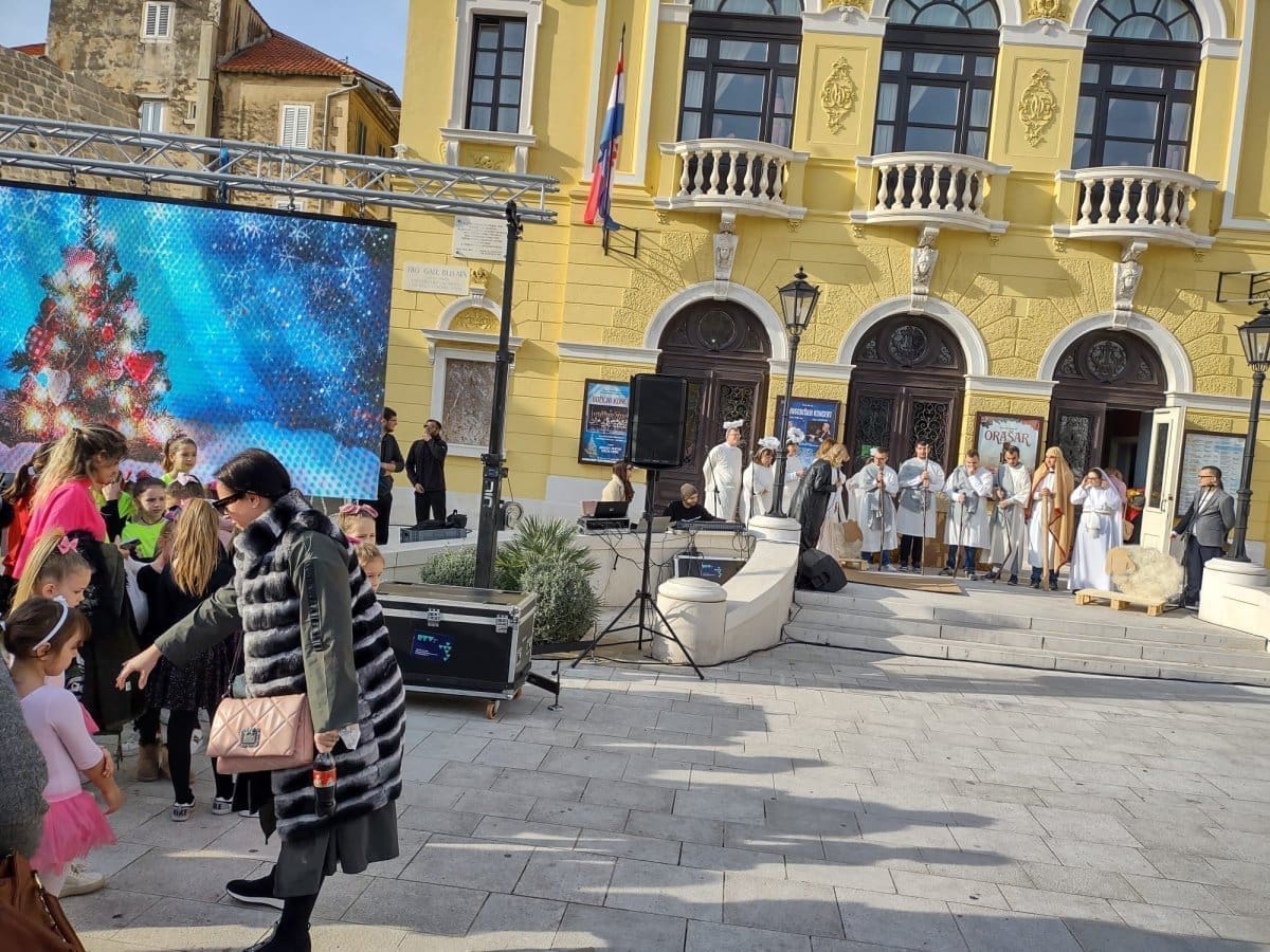 Na Trgu Gaje Bulata, ispred zgrade Hrvatskog narodnog kazališta Split, jutros je održan božićno-novogodišnji program „Ususret Božiću s veseljem“ u kojem su sudjelovala djeca, ali i odrasli, iz Centra Juraj Bonaći, Talent Studia M, Cheerleading kluba Noa, Baletnog studija Školjkica te dječjeg zbora Srdelice, uz nastup seniorki Splitskih mažoretkinja.